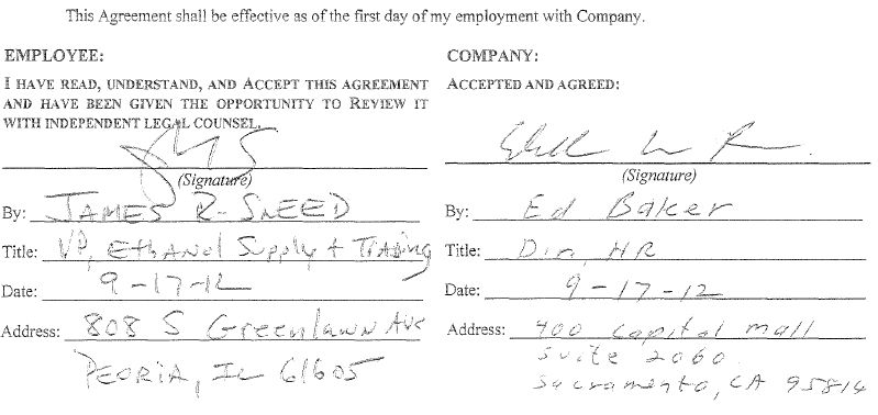 This Employment Agreement ("Agreement") by and between James Sneed ("Employee") and Pacific Ethanol, Inc. (the "Company") (collectively, the "Parties") is effective as of the last date signed by the Parties.