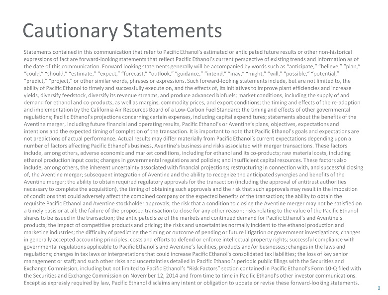 2 2 Statements contained in this communication that refer to Pacific Ethanol’s estimated or anticipated future results or other n on - historical expressions of fact are forward - looking statements that reflect Pacific Ethanol’s current perspective of existing trends and inf ormation as of the date of this communication. Forward looking statements generally will be accompanied by words such as “anticipate,” “beli eve ,” “plan,” “could,” “should,” “estimate,” “expect,” “forecast,” “outlook,” “guidance,” “intend,” “may,” “might,” “will,” “possible,” “po ten tial,” “predict,” “project,” or other similar words, phrases or expressions. Such forward - looking statements include, but are not limit ed to, the ability of Pacific Ethanol to timely and successfully execute on, and the effects of, its initiatives to improve plant effici enc ies and increase yields, diversify feedstock, diversify its revenue streams, and produce advanced biofuels; market conditions, including the s upp ly of and demand for ethanol and co - products, as well as margins, commodity prices, and export conditions; the timing and effects of the r e - adoption and implementation by the California Air Resources Board of a Low - Carbon Fuel Standard; the timing and effects of other governmental regulations ; Pacific Ethanol’s projections concerning certain expenses, including capital expenditures; statements about the benefits of the Aventine merger, including future financial and operating results, Pacific Ethanol’s or Aventine’s plans, objectives, expecta tio ns and intentions and the expected timing of completion of the transaction. It is important to note that Pacific Ethanol’s goals and ex pectations are not predictions of actual performance. Actual results may differ materially from Pacific Ethanol’s current expectations depen din g upon a number of factors affecting Pacific Ethanol’s business, Aventine’s business and risks associated with merger transactions. Th ese factors include, among others, adverse economic and market conditions, including for ethanol and its co - products; raw material costs, in cluding ethanol production input costs; changes in governmental regulations and policies; and insufficient capital resources. These f act ors also include, among others, the inherent uncertainty associated with financial projections; restructuring in connection with, and suc cessful closing of, the Aventine merger; subsequent integration of Aventine and the ability to recognize the anticipated synergies and benefi ts of the Aventine merger; the ability to obtain required regulatory approvals for the transaction (including the approval of antitrust au thorities necessary to complete the acquisition), the timing of obtaining such approvals and the risk that such approvals may result in th e imposition of conditions that could adversely affect the combined company or the expected benefits of the transaction; the ability to ob tai n the requisite Pacific Ethanol and Aventine stockholder approvals; the risk that a condition to closing the Aventine merger may no t b e satisfied on a timely basis or at all; the failure of the proposed transaction to close for any other reason; risks relating to the value of the Pacific Ethanol shares to be issued in the transaction; the anticipated size of the markets and continued demand for Pacific Ethanol’s and Av ent ine’s products; the impact of competitive products and pricing; the risks and uncertainties normally incident to the ethanol produc tio n and marketing industries; the difficulty of predicting the timing or outcome of pending or future litigation or government invest iga tions; changes in generally accepted accounting principles; costs and efforts to defend or enforce intellectual property rights; successful com pliance with governmental regulations applicable to Pacific Ethanol’s and Aventine’s facilities, products and/or businesses; changes in th e l aws and regulations; changes in tax laws or interpretations that could increase Pacific Ethanol’s consolidated tax liabilities; the l oss of key senior management or staff; and such other risks and uncertainties detailed in Pacific Ethanol’s periodic public filings with the Se cur ities and Exchange Commission, including but not limited to Pacific Ethanol’s “Risk Factors” section contained in Pacific Ethanol’s For m 1 0 - Q filed with the Securities and Exchange Commission on November 12, 2014 and from time to time in Pacific Ethanol’s other investor communi cat ions. Except as expressly required by law, Pacific Ethanol disclaims any intent or obligation to update or revise these forward - lookin g statements. Cautionary Statements