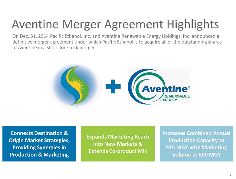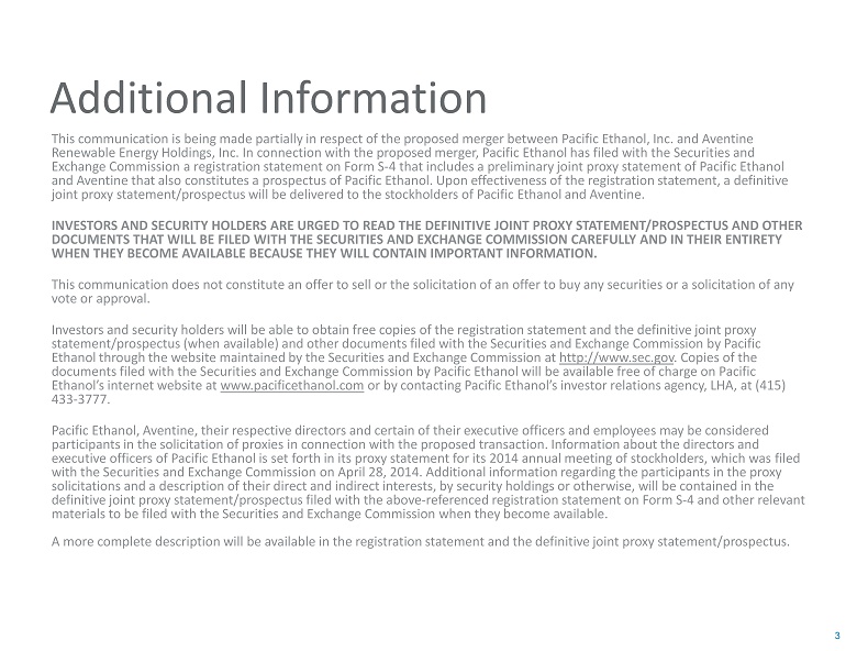 3 3 Additional Information This communication is being made partially in respect of the proposed merger between Pacific Ethanol, Inc. and Aventine Renewable Energy Holdings, Inc. In connection with the proposed merger, Pacific Ethanol has filed with the Securities and Exchange Commission a registration statement on Form S - 4 that includes a preliminary joint proxy statement of Pacific Ethanol and Aventine that also constitutes a prospectus of Pacific Ethanol. Upon effectiveness of the registration statement, a defin iti ve joint proxy statement/prospectus will be delivered to the stockholders of Pacific Ethanol and Aventine. INVESTORS AND SECURITY HOLDERS ARE URGED TO READ THE DEFINITIVE JOINT PROXY STATEMENT/PROSPECTUS AND OTHER DOCUMENTS THAT WILL BE FILED WITH THE SECURITIES AND EXCHANGE COMMISSION CAREFULLY AND IN THEIR ENTIRETY WHEN THEY BECOME AVAILABLE BECAUSE THEY WILL CONTAIN IMPORTANT INFORMATION. This communication does not constitute an offer to sell or the solicitation of an offer to buy any securities or a solicitati on of any vote or approval. Investors and security holders will be able to obtain free copies of the registration statement and the definitive joint prox y statement/prospectus (when available) and other documents filed with the Securities and Exchange Commission by Pacific Ethanol through the website maintained by the Securities and Exchange Commission at http://www.sec.gov . Copies of the documents filed with the Securities and Exchange Commission by Pacific Ethanol will be available free of charge on Pacific Ethanol’s internet website at www.pacificethanol.com or by contacting Pacific Ethanol’s investor relations agency, LHA, at (415) 433 - 3777. Pacific Ethanol, Aventine, their respective directors and certain of their executive officers and employees may be considered participants in the solicitation of proxies in connection with the proposed transaction. Information about the directors and executive officers of Pacific Ethanol is set forth in its proxy statement for its 2014 annual meeting of stockholders, which was filed with the Securities and Exchange Commission on April 28, 2014. Additional information regarding the participants in the proxy solicitations and a description of their direct and indirect interests, by security holdings or otherwise, will be contained in the definitive joint proxy statement/prospectus filed with the above - referenced registration statement on Form S - 4 and other relevant materials to be filed with the Securities and Exchange Commission when they become available. A more complete description will be available in the registration statement and the definitive joint proxy statement/prospect us.