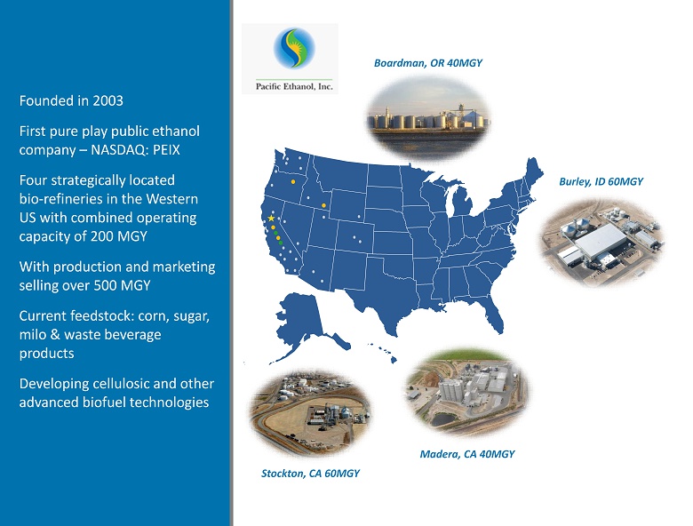 Founded in 2003 First pure play public ethanol company – NASDAQ: PEIX Four strategically located bio - refineries in the Western US with combined operating capacity of 200 MGY With production and marketing selling over 500 MGY Current feedstock: corn, sugar, milo & waste beverage products Developing cellulosic and other advanced biofuel technologies Burley, ID 60MGY Boardman, OR 40MGY Madera, CA 40MGY Stockton, CA 60MGY