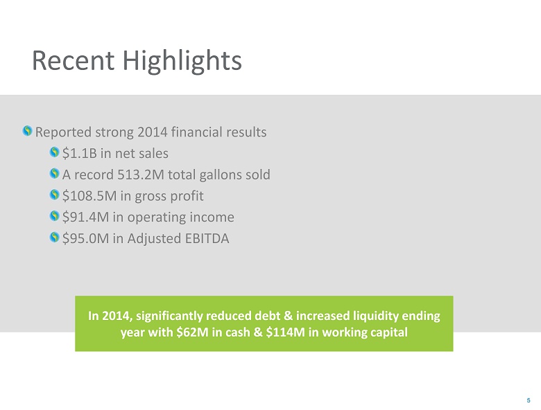 5 5 Recent Highlights Reported strong 2014 financial results $1.1B in net sales A r ecord 513.2M total gallons sold $108.5M in gross profit $ 91.4M in operating income $ 95.0M in Adjusted EBITDA In 2014, significantly reduced debt & increased liquidity ending year with $62M in cash & $114M in working capital