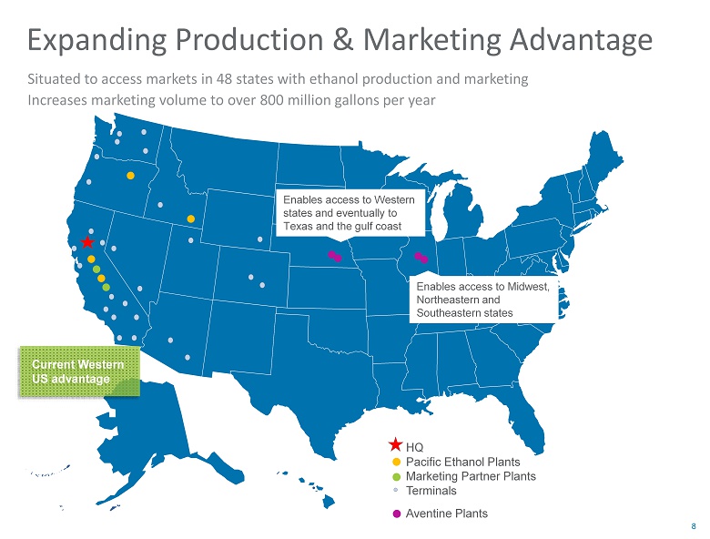 7 7 Aventine Merger Agreement Highlights On Dec. 31, 2014 Pacific Ethanol, Inc. and Aventine Renewable Energy Holdings, Inc. announced a definitive merger agreement under which Pacific Ethanol is to acquire all of the outstanding shares of Aventine in a stock - for - stock merger. Connects Destination & Origin Market Strategies, Providing Synergies in Production & Marketing Expands Marketing Reach into New Markets & Extends Co - product Mix Increases Combined Annual Production Capacity to 515 MGY with Marketing Volume to 800 MGY
