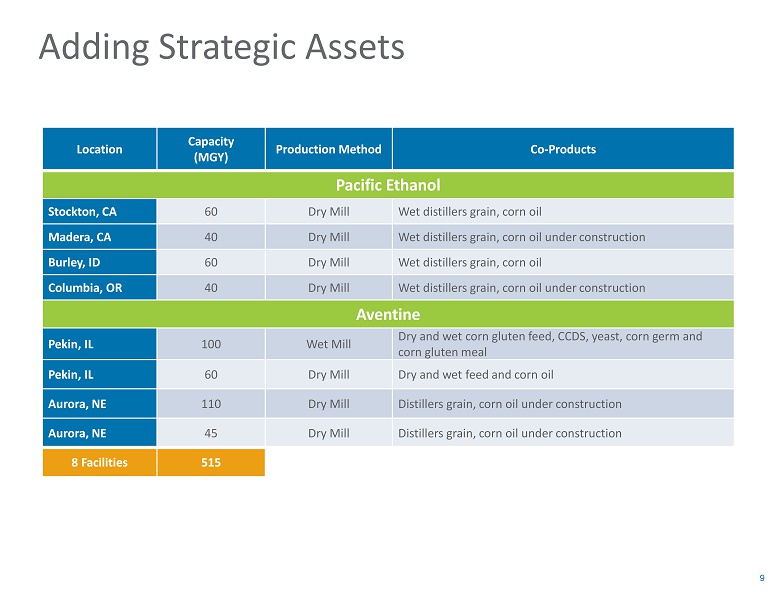 8 8 Expanding Production & Marketing Advantage HQ Pacific Ethanol Plants Marketing Partner Plants Terminals Aventine Plants Situated to access markets in 48 states with ethanol production and marketing Increases marketing volume to over 800 million gallons per year Current Western US advantage Enables access to Western states and eventually to Texas and the gulf coast Enables access to Midwest, Northeastern and Southeastern states