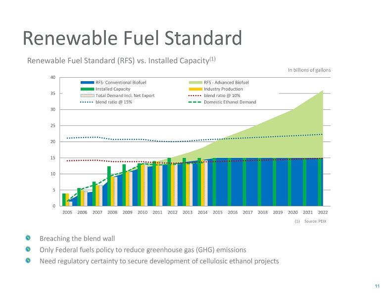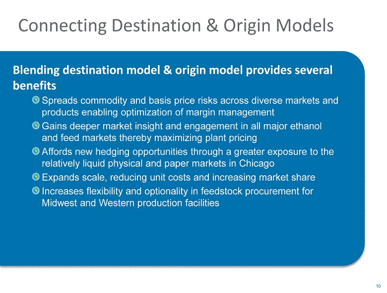 10 10 Connecting Destination & Origin Models Blending destination model & origin model provides several benefits Spreads commodity and basis price risks across diverse markets and products enabling optimization of margin management Gains deeper market insight and engagement in all major ethanol and feed markets thereby maximizing plant pricing Affords new hedging opportunities through a greater exposure to the relatively liquid physical and paper markets in Chicago Expands scale , reducing unit costs and increasing market share Increases flexibility and optionality in feedstock procurement for Midwest and Western production facilities