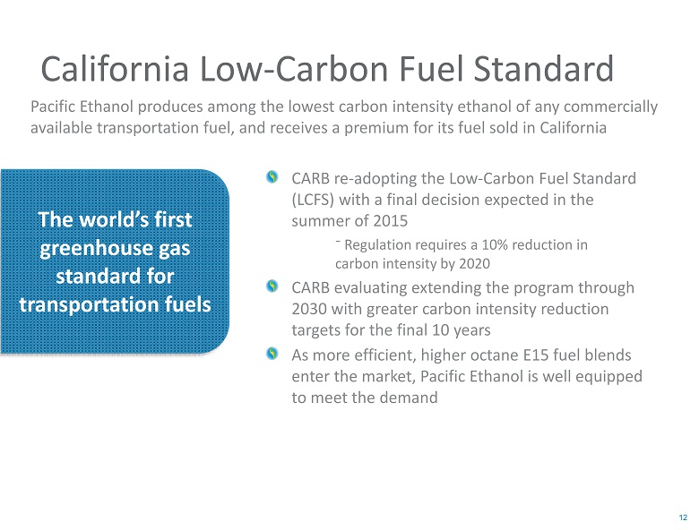 11 In billions of gallons (1) Source: PEIX Renewable Fuel Standard (RFS) vs. Installed Capacity (1) Renewable Fuel Standard Breaching the blend wall Only Federal fuels policy to reduce greenhouse gas (GHG) emissions Need regulatory certainty to secure development of cellulosic ethanol projects 0 5 10 15 20 25 30 35 40 2005 2006 2007 2008 2009 2010 2011 2012 2013 2014 2015 2016 2017 2018 2019 2020 2021 2022 RFS- Conventional Biofuel RFS - Advanced Biofuel Installed Capacity Industry Production Total Demand Incl. Net Export blend ratio @ 10% blend ratio @ 15% Domestic Ethanol Demand