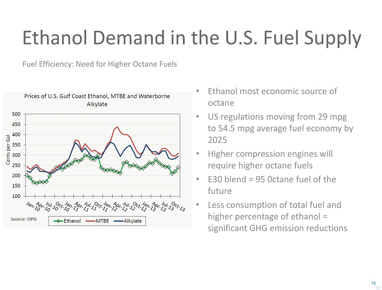 12 California Low - Carbon Fuel Standard The world’s first greenhouse gas standard for transportation fuels CARB re - adopting the Low - Carbon Fuel Standard (LCFS) with a final decision expected in the summer of 2015 ⁻ Regulation requires a 10% reduction in carbon intensity by 2020 CARB evaluating extending the program through 2030 with greater carbon intensity reduction targets for the final 10 years As more efficient, higher octane E15 fuel blends enter the market, Pacific Ethanol is well equipped to meet the demand Pacific Ethanol produces among the lowest carbon intensity ethanol of any commercially available transportation fuel, and receives a premium for its fuel sold in California