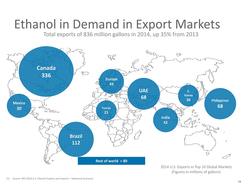 13 • Ethanol most economic source of octane • US regulations moving from 29 mpg to 54.5 mpg average fuel economy by 2025 • Higher compression engines will require higher octane fuels • E30 blend = 95 0ctane fuel of the future • Less consumption of total fuel and higher percentage of ethanol = significant GHG emission reductions Ethanol Demand in the U.S. Fuel Supply Fuel Efficiency: Need for Higher Octane Fuels