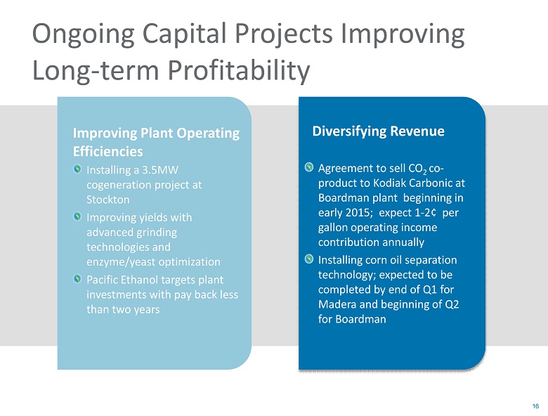 15 15 Recent Industry Dynamics Fundamentals unchanged despite recent seasonality Achieving a better supply & demand balance to result in improved production margins US exports remain strong in 2015 Source: CME 1.00 1.50 2.00 2.50 3.00 3.50 4.00 RBOB Gasoline and Ethanol Prices (Nearby Futures) Ethanol Futures RBOB Futures