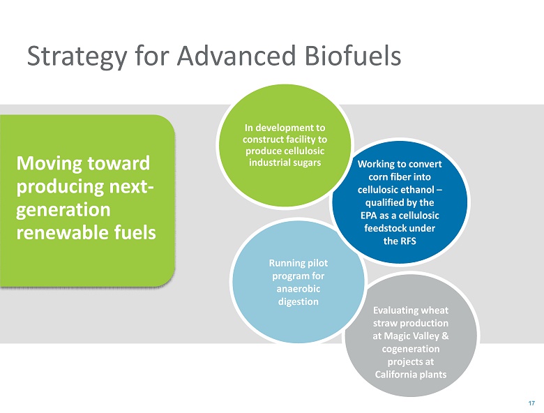 17 17 Evaluating wheat straw production at Magic Valley & cogeneration projects at California plants Strategy for Advanced Biofuels Running pilot program for anaerobic digestion Working to convert corn fiber into cellulosic ethanol – qualified by the EPA as a cellulosic feedstock under the RFS In development to construct facility to produce cellulosic industrial sugars Moving toward producing next - generation renewable fuels