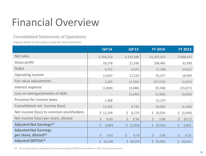 18 18 Q4’14 Q4’13 FY 2014 FY 2013 Net sales $ 256,152 $ 215,290 $1,107,412 $ 908,437 Gross profit 18,378 21,596 108,485 32,930 SG&A 4,731 4,372 17,108 14,021 Operating income 13,647 17,224 91,377 18,909 Fair value adjustments 2,205 (2,520) (37,532) (1,013) Interest expense (1,068) (3,688) (9,438) (15,671) Loss on extinguishments of debt – (1,240) (2,363) (3,035) Provision for income taxes 1,508 – 15,137 – Consolidated net income (loss) 13,105 9,745 26,002 (1,162) Net income (loss) to common stockholders $ 12,199 $ 8,274 $ 20,024 $ (2,046) Net income (loss) per share, diluted $ 0.50 $ 0.54 $ 0.88 $ (0.17) Adjusted Net Earnings (1) $ 9,994 $ 12,034 $ 59,919 $ 2,002 Adjusted Net Earnings per share, diluted (1) $ 0.41 $ 0.79 $ 2.64 $ 0.16 Adjusted EBITDA (1) $ 16,330 $ 18,259 $ 95,001 $ 28,633 Financial Overview (1) R econciling tables for Adjusted Net Earnings and Adjusted EBITDA are available on slide 24 of the presentation (Figures below in thousands, except per share amounts) Consolidated Statements of Operations
