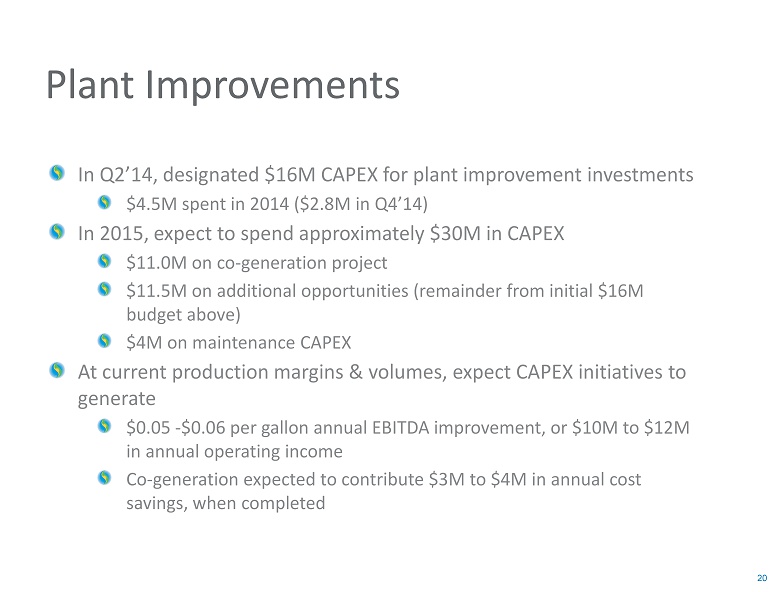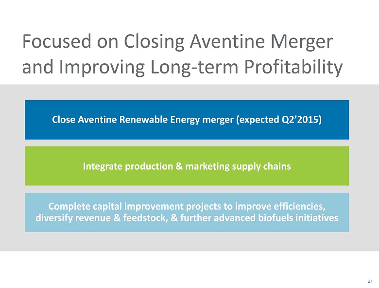 20 20 Plant Improvements In Q2’14, designated $16M CAPEX for plant improvement investments $4.5M spent in 2014 ($ 2.8M in Q4’14) In 2015, expect to spend approximately $30M in CAPEX $ 11.0M on co - generation project $ 11.5M on additional opportunities (remainder from initial $16M budget above) $4M on maintenance CAPEX At current production margins & volumes, expect CAPEX initiatives to generate $0.05 - $0.06 per gallon annual EBITDA improvement, or $10M to $12M in annual operating income Co - generation expected to contribute $3M to $4M in annual cost savings, when completed