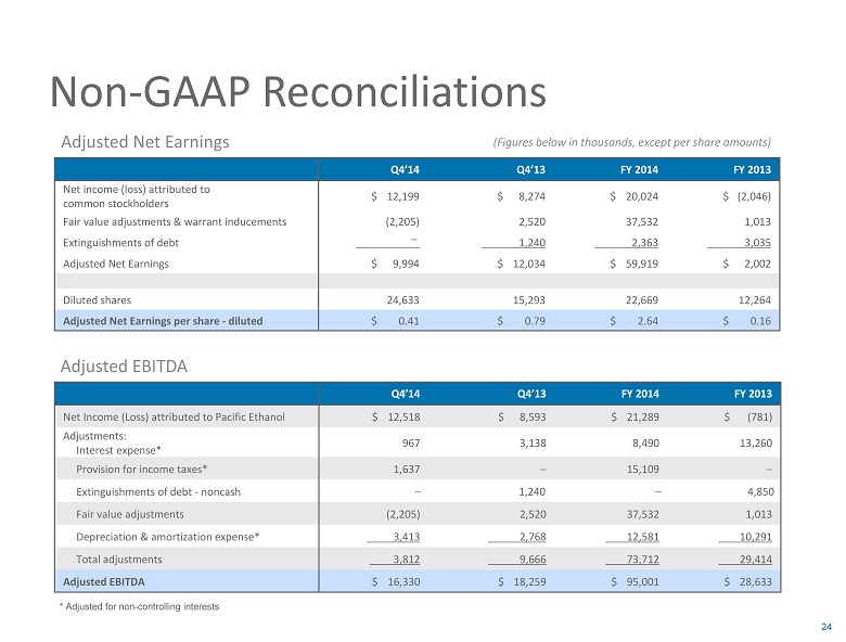 24 24 * Adjusted for non - controlling interests Non - GAAP Reconciliations Q4’14 Q4’13 FY 2014 FY 2013 Net Income (Loss) attributed to Pacific Ethanol $ 12,518 $ 8,593 $ 21,289 $ (781) Adjustments: Interest expense* 967 3,138 8,490 13,260 Provision for income taxes* 1,637 – 15,109 – Extinguishments of debt - noncash – 1,240 – 4,850 Fair value adjustments (2,205) 2,520 37,532 1,013 Depreciation & amortization expense* 3,413 2,768 12,581 10,291 Total adjustments 3,812 9,666 73,712 29,414 Adjusted EBITDA $ 16,330 $ 18,259 $ 95,001 $ 28,633 (Figures below in thousands, except per share amounts) Adjusted EBITDA Adjusted Net Earnings Q4’14 Q4’13 FY 2014 FY 2013 Net income (loss) attributed to common stockholders $ 12,199 $ 8,274 $ 20,024 $ (2,046) Fair value adjustments & warrant inducements (2,205) 2,520 37,532 1,013 Extinguishments of debt 1,240 2,363 3,035 Adjusted Net Earnings $ 9,994 $ 12,034 $ 59,919 $ 2,002 Diluted shares 24,633 15,293 22,669 12,264 Adjusted Net Earnings per share - diluted $ 0.41 $ 0.79 $ 2.64 $ 0.16 _