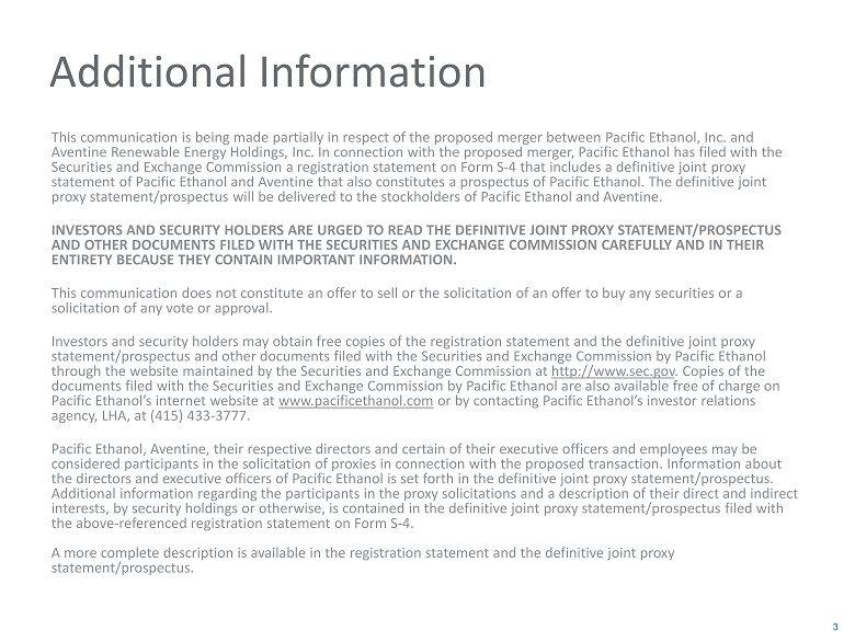 2 2 Statements contained in this communication that refer to Pacific Ethanol’s estimated or anticipated future results or other non - historical expressions of fact are forward - looking statements that reflect Pacific Ethanol’s current perspective of existing trends and inf ormation as of the date of this communication. Forward looking statements generally will be accompanied by words such as “anticipate,” “believe, ” “ plan,” “could,” “should,” “estimate,” “expect,” “forecast,” “outlook,” “guidance,” “intend,” “may,” “might,” “will,” “possible,” “potential,” “p redict,” “project,” or other similar words, phrases or expressions. Such forward - looking statements include, but are not limited to, the ability of Pac ific Ethanol to timely and successfully execute on, and the effects of, its initiatives to improve plant efficiencies and increase yields, reduce pr odu ction costs, diversify feedstock, diversify its revenue streams and generate additional revenue, produce advanced biofuels and lower the carbon intensity of ethanol produced; market conditions, including the supply of and demand for ethanol and co - products, as well as margins, commodity prices, export conditions and increasing blend rates; the timing and effects of corn oil production; statements about the benefits of the Aventine merger, including future financial and operating results, Pacific Ethanol’s or Aventine’s plans, objectives, expectations and intenti ons and the expected timing of completion of the transaction. It is important to note that Pacific Ethanol’s goals and expectations are not predic tio ns of actual performance. Actual results may differ materially from Pacific Ethanol’s current expectations depending upon a number of fact ors affecting Pacific Ethanol’s business, Aventine’s business and risks associated with merger transactions. These factors include, among others, a dve rse economic and market conditions, including for ethanol and its co - products; raw material costs, including ethanol production input costs; chan ges in governmental regulations and policies; and insufficient capital resources. These factors also include, among others, the inherent uncertai nty associated with financial projections; restructuring in connection with, and successful closing of, the Aventine merger; subsequent integrati on of Aventine and the ability to recognize the anticipated synergies and benefits of the Aventine merger; the ability to obtain required regulatory ap provals for the transaction (including the approval of antitrust authorities necessary to complete the acquisition), the timing of obtaining suc h approvals and the risk that such approvals may result in the imposition of conditions that could adversely affect the combined company or the e xpe cted benefits of the transaction; the ability to obtain the requisite Pacific Ethanol and Aventine stockholder approvals; the risk that a cond iti on to closing the Aventine merger may not be satisfied on a timely basis or at all; the failure of the proposed transaction to close for any ot her reason; risks relating to the value of the Pacific Ethanol shares to be issued in the transaction; the anticipated size of the markets and continued de mand for Pacific Ethanol’s and Aventine’s products; the impact of competitive products and pricing; the risks and uncertainties normally incid ent to the ethanol production and marketing industries; the difficulty of predicting the timing or outcome of pending or future litigation or go ver nment investigations; changes in generally accepted accounting principles; costs and efforts to defend or enforce intellectual property rights; suc ces sful compliance with governmental regulations applicable to Pacific Ethanol’s and Aventine’s facilities, products and/or businesses; changes in th e l aws and regulations; changes in tax laws or interpretations that could increase Pacific Ethanol’s consolidated tax liabilities; the loss of key se nio r management or staff; and such other risks and uncertainties detailed in Pacific Ethanol’s periodic public filings with the Securities and Exchange Co mmission, including but not limited to Pacific Ethanol’s “Risk Factors” section contained in Pacific Ethanol’s Form 10 - Q filed with the Securities a nd Exchange Commission on May 11, 2015 and from time to time in Pacific Ethanol’s other investor communications. Except as expressly requ ire d by law, Pacific Ethanol disclaims any intent or obligation to update or revise these forward - looking statements. Cautionary Statements