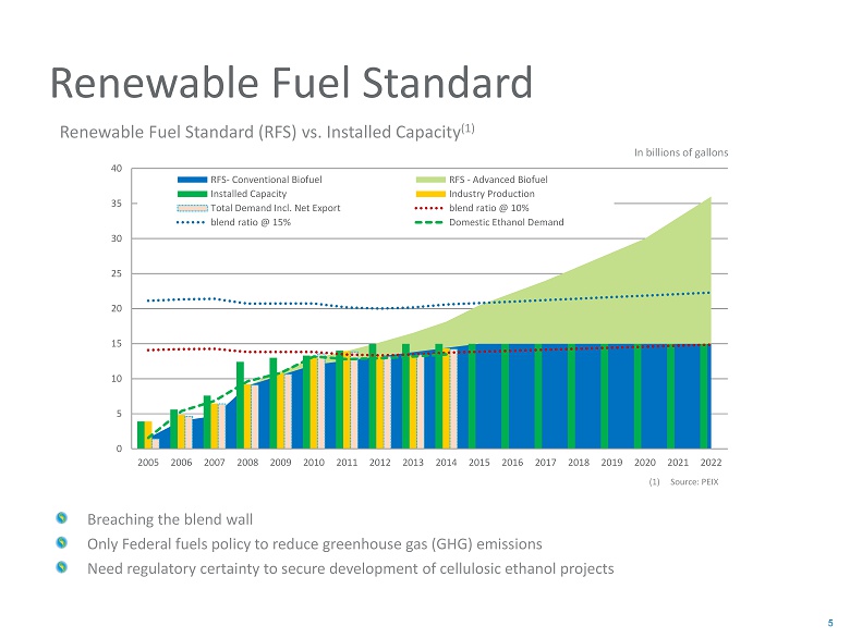 Founded in 2003 First pure play public ethanol company – NASDAQ: PEIX Four strategically located bio - refineries in the Western US with combined operating capacity of 200 MGY With production and marketing selling over 500 MGY Current feedstock: corn, sugar, milo & waste beverage products Developing cellulosic and other advanced biofuel technologies Burley, ID 60MGY Boardman, OR 40MGY Madera, CA 40MGY Stockton, CA 60MGY