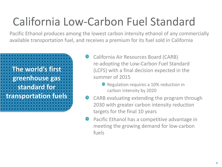 5 In billions of gallons (1) Source: PEIX Renewable Fuel Standard (RFS) vs. Installed Capacity (1) Renewable Fuel Standard Breaching the blend wall Only Federal fuels policy to reduce greenhouse gas (GHG) emissions Need regulatory certainty to secure development of cellulosic ethanol projects 0 5 10 15 20 25 30 35 40 2005 2006 2007 2008 2009 2010 2011 2012 2013 2014 2015 2016 2017 2018 2019 2020 2021 2022 RFS- Conventional Biofuel RFS - Advanced Biofuel Installed Capacity Industry Production Total Demand Incl. Net Export blend ratio @ 10% blend ratio @ 15% Domestic Ethanol Demand