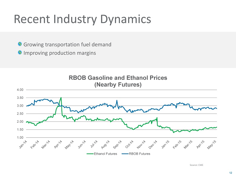 12 12 Recent Industry Dynamics Growing transportation fuel demand Improving production margins Source: CME 1.00 1.50 2.00 2.50 3.00 3.50 4.00 RBOB Gasoline and Ethanol Prices (Nearby Futures) Ethanol Futures RBOB Futures