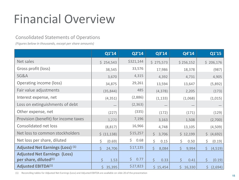 15 15 Q1’14 Q2’14 Q3’14 Q4’14 Q1’15 Net sales $ 254,543 $ 321,144 $ 275,573 $ 256,152 $ 206,176 Gross profit (loss) 38,545 33,576 17,986 18,378 (987) SG&A 3,670 4,315 4,392 4,731 4,905 Operating income (loss) 34,875 29,261 13,594 13,647 (5,892) Fair value adjustments (35,844) 485 (4,378) 2,205 (173) Interest expense, net (4,351) (2,886) (1,133) (1,068) (1,015) Loss on extinguishments of debt — (2,363) — — — Other expense, net (227) (335) (172) (171) (129) Provision (benefit) for income taxes 3,270 7,196 3,163 1,508 (2,700) Consolidated net loss (8,817) 16,966 4,748 13,105 (4,509) Net loss to common stockholders $ (11,138) $ 15,257 $ 3,706 $ 12,199 $ (4,692) Net loss per share, diluted $ (0.69) $ 0.68 $ 0.15 $ 0.50 $ (0.19) Adjusted Net Earnings (Loss) (1) $ 24,706 $ 17,135 $ 8,084 $ 9,994 $ (4,519) Adjusted Net Earnings (Loss) per share, diluted (1) $ 1.53 $ 0.77 $ 0.33 $ 0.41 $ (0.19) Adjusted EBITDA (1) $ 35,395 $ 27,823 $ 15,454 $ 16,330 $ (2,694) Financial Overview (1) R econciling tables for Adjusted Net Earnings (Loss) and Adjusted EBITDA are available on slide 20 of the presentation (Figures below in thousands, except per share amounts) Consolidated Statements of Operations