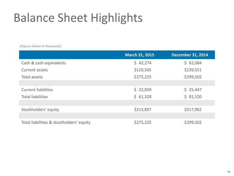 16 16 March 31, 2015 December 31, 2014 Cash & cash equivalents $ 42,274 $ 62,084 Current assets $110,565 $139,551 Total assets $ 275,225 $ 299,502 Current liabilities $ 22,839 $ 25,447 Total liabilities $ 61,328 $ 81,520 Stockholders’ equity $213,897 $217,982 Total liabilities & stockholders’ equity $ 275,225 $ 299,502 Balance Sheet Highlights (Figures below in thousands)