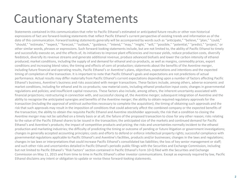 2 2 Statements contained in this communication that refer to Pacific Ethanol’s estimated or anticipated future results or other non - historical expressions of fact are forward - looking statements that reflect Pacific Ethanol’s current perspective of existing trends and inf ormation as of the date of this communication. Forward looking statements generally will be accompanied by words such as “anticipate,” “believe, ” “ plan,” “could,” “should,” “estimate,” “expect,” “forecast,” “outlook,” “guidance,” “intend,” “may,” “might,” “will,” “possible,” “potential,” “p redict,” “project,” or other similar words, phrases or expressions. Such forward - looking statements include, but are not limited to, the ability of Pac ific Ethanol to timely and successfully execute on, and the effects of, its initiatives to improve plant efficiencies and increase yields, reduce pr odu ction costs, diversify feedstock, diversify its revenue streams and generate additional revenue, produce advanced biofuels and lower the carbon intensity of ethanol produced; market conditions, including the supply of and demand for ethanol and co - products, as well as margins, commodity prices, export conditions and increasing blend rates; the timing and effects of corn oil production; statements about the benefits of the Aventine merger, including future financial and operating results, Pacific Ethanol’s or Aventine’s plans, objectives, expectations and intenti ons and the expected timing of completion of the transaction. It is important to note that Pacific Ethanol’s goals and expectations are not predic tio ns of actual performance. Actual results may differ materially from Pacific Ethanol’s current expectations depending upon a number of fact ors affecting Pacific Ethanol’s business, Aventine’s business and risks associated with merger transactions. These factors include, among others, a dve rse economic and market conditions, including for ethanol and its co - products; raw material costs, including ethanol production input costs; chan ges in governmental regulations and policies; and insufficient capital resources. These factors also include, among others, the inherent uncertai nty associated with financial projections; restructuring in connection with, and successful closing of, the Aventine merger; subsequent integrati on of Aventine and the ability to recognize the anticipated synergies and benefits of the Aventine merger; the ability to obtain required regulatory ap provals for the transaction (including the approval of antitrust authorities necessary to complete the acquisition), the timing of obtaining suc h approvals and the risk that such approvals may result in the imposition of conditions that could adversely affect the combined company or the e xpe cted benefits of the transaction; the ability to obtain the requisite Pacific Ethanol and Aventine stockholder approvals; the risk that a cond iti on to closing the Aventine merger may not be satisfied on a timely basis or at all; the failure of the proposed transaction to close for any ot her reason; risks relating to the value of the Pacific Ethanol shares to be issued in the transaction; the anticipated size of the markets and continued de mand for Pacific Ethanol’s and Aventine’s products; the impact of competitive products and pricing; the risks and uncertainties normally incid ent to the ethanol production and marketing industries; the difficulty of predicting the timing or outcome of pending or future litigation or go ver nment investigations; changes in generally accepted accounting principles; costs and efforts to defend or enforce intellectual property rights; suc ces sful compliance with governmental regulations applicable to Pacific Ethanol’s and Aventine’s facilities, products and/or businesses; changes in th e l aws and regulations; changes in tax laws or interpretations that could increase Pacific Ethanol’s consolidated tax liabilities; the loss of key se nio r management or staff; and such other risks and uncertainties detailed in Pacific Ethanol’s periodic public filings with the Securities and Exchange Co mmission, including but not limited to Pacific Ethanol’s “Risk Factors” section contained in Pacific Ethanol’s Form 10 - Q filed with the Securities a nd Exchange Commission on May 11, 2015 and from time to time in Pacific Ethanol’s other investor communications. Except as expressly requ ire d by law, Pacific Ethanol disclaims any intent or obligation to update or revise these forward - looking statements. Cautionary Statements