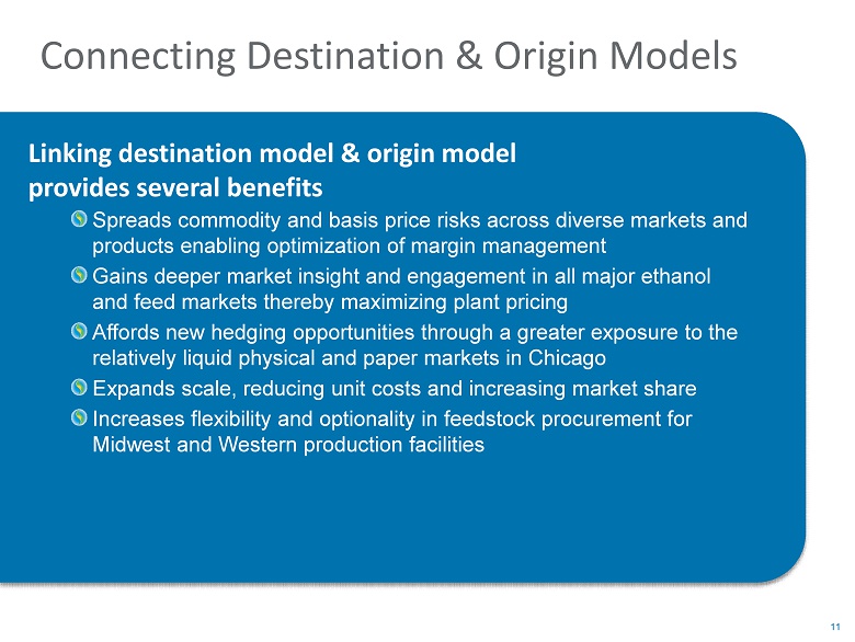 11 11 Connecting Destination & Origin Models Linking destination model & origin model provides several benefits Spreads commodity and basis price risks across diverse markets and products enabling optimization of margin management Gains deeper market insight and engagement in all major ethanol and feed markets thereby maximizing plant pricing Affords new hedging opportunities through a greater exposure to the relatively liquid physical and paper markets in Chicago Expands scale , reducing unit costs and increasing market share Increases flexibility and optionality in feedstock procurement for Midwest and Western production facilities