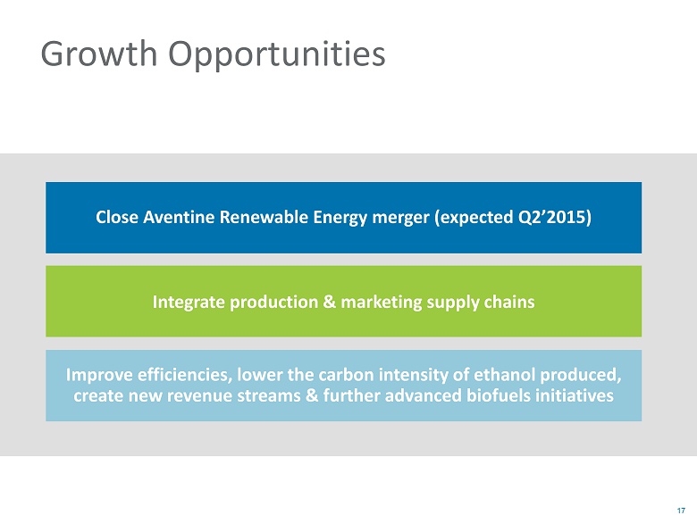 17 17 Close Aventine Renewable Energy merger (expected Q2’2015) Improve efficiencies, lower the carbon intensity of ethanol produced, create new revenue streams & further advanced biofuels initiatives Growth Opportunities Integrate production & marketing supply chains