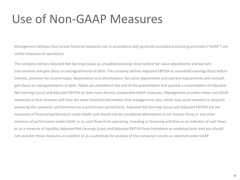 19 19 Use of Non - GAAP Measures Management believes that certain financial measures not in accordance with generally accepted accounting principles (“GAAP”) are useful measures of operations . The company defines Adjusted Net Earnings (Loss) as unaudited earnings (loss ) before fair value adjustments and warrant inducements and gain (loss) on extinguishments of debt. The company defines Adjusted EBITDA as unaudited earnings (loss ) before interest, provision for income taxes, depreciation and amortization, fair value adjustments and warrant inducements and nonca sh gain (loss) on extinguishments of debt. Tables are provided at the end of this presentation that provide a reconciliation of Adjusted Net Earnings (Loss) and Adjusted EBITDA to their most directly comparable GAAP measures. Management provides these non - GAAP measures so that investors will have the same financial information that management uses, which may assist investors in prope rly assessing the company’s performance on a period - over - period basis. Adjusted Net Earnings (Loss) and Adjusted EBITDA are not measures of financial performance under GAAP, and should not be considered alternatives to net income (loss) or any other measure of performance under GAAP, or to cash flows from operating, investing or financing activities as an indicator of cash fl ows or as a measure of liquidity. Adjusted Net Earnings (Loss) and Adjusted EBITDA have limitations as analytical tools and you should not consider these measures in isolation or as a substitute for analysis of the company’s results as reported under GAAP.