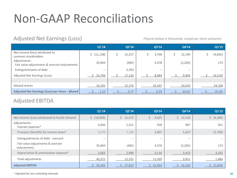 20 20 * Adjusted for non - controlling interests Non - GAAP Reconciliations Q1’14 Q2’14 Q3’14 Q4’14 Q1’15 Net Income (Loss) attributed to Pacific Ethanol $ (10,826) $ 15,572 $ 4,025 $ 12,518 $ (4,380) Adjustments: Interest expense* 4,044 2,551 928 967 921 Provision (benefit) for income taxes* 3,270 7,196 3,007 1,637 (2,700) Extinguishments of debt - noncash -- -- -- -- -- Fair value adjustments & warrant inducements 35,844 (485) 4,378 (2,205) 173 Depreciation & amortization expense* 3,063 2,989 3,116 3,413 3,292 Total adjustments 46,221 12,251 11,429 3,812 1,686 Adjusted EBITDA $ 35,395 $ 27,823 $ 15,454 $ 16,330 $ (2,694) (Figures below in thousands, except per share amounts) Adjusted EBITDA Adjusted Net Earnings (Loss) Q1’14 Q2’14 Q3’14 Q4’14 Q1’15 Net income (loss) attributed to common stockholders $ (11,138) $ 15,257 $ 3,706 $ 12,199 $ (4,692) Adjustments: Fair value adjustments & warrant inducements 35,844 (485) 4,378 (2,205) 173 Extinguishments of debt -- 2,363 -- -- -- Adjusted Net Earnings (Loss) $ 24,706 $ 17,135 $ 8,084 $ 9,994 $ (4,519) Diluted shares 16,181 22,276 24,307 24,633 24,104 Adjusted Net Earnings (Loss) per share - diluted $ 1.53 $ 0.77 $ 0.33 $ (0.41) $ (0.19)