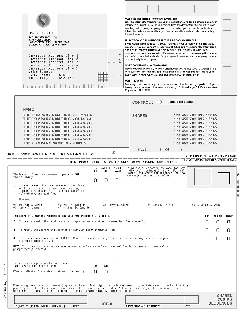 INTERNET AVAILABILITY OF PROXY MATERIALS WE USE THE INTERNET AS OUR PRIMARY MEANS OF FURNISHING PROXY MATERIALS TO OUR STOCKHOLDERS. CONSEQUENTLY, MOST STOCKHOLDERS WILL NOT RECEIVE PAPER COPIES OF OUR PROXY MATERIALS. WE WILL INSTEAD SEND EACH STOCKHOLDER A NOTICE OF INTERNET AVAILABILITY OF PROXY MATERIALS WITH INSTRUCTIONS FOR ACCESSING OVER THE INTERNET THE PROXY MATERIALS, INCLUDING OUR PROXY STATEMENT AND ANNUAL REPORT, AND VOTING ELECTRONICALLY OVER THE INTERNET. THE NOTICE OF INTERNET AVAILABILITY OF PROXY MATERIALS ALSO PROVIDES INFORMATION ON HOW STOCKHOLDERS MAY OBTAIN PAPER COPIES OF OUR PROXY MATERIALS IF THEY SO CHOOSE. WE BELIEVE ELECTRONIC DELIVERY OF OUR PROXY MATERIALS AND ANNUAL REPORT WILL HELP PACIFIC ETHANOL, INC. REDUCE THE ENVIRONMENTAL IMPACT AND COSTS OF PRINTING AND DISTRIBUTING PAPER COPIES AND IMPROVE THE SPEED AND EFFICIENCY BY WHICH YOU CAN ACCESS THESE MATERIALS. IF YOU PREVIOUSLY ELECTED TO RECEIVE OUR PROXY MATERIALS ELECTRONICALLY, THESE MATERIALS WILL CONTINUE TO BE SENT VIA EMAIL UNLESS YOU CHANGE YOUR ELECTION. |
