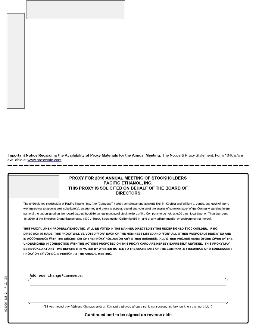 NOTICE IS HEREBY GIVEN that the 2016 annual meeting (“Annual Meeting”) of stockholders of Pacific Ethanol, Inc., a Delaware corporation, will be held at 9:00 a.m., local time, on Thursday, June 16, 2016 at the Sheraton Grand Sacramento, 1230 J Street, Sacramento, California 95814, for the following purposes, as more fully described in the Proxy Statement accompanying this notice: