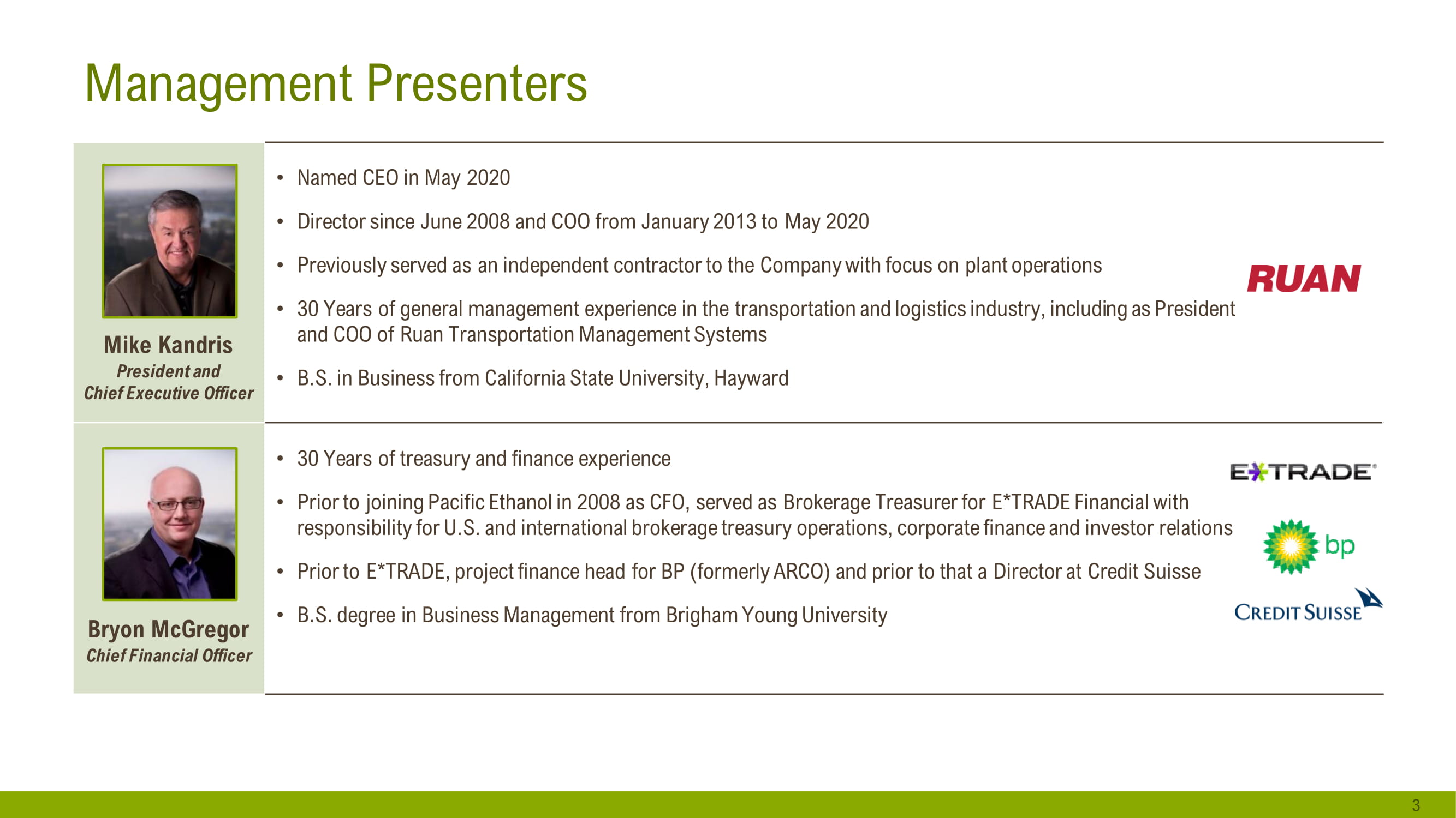 Disclaimer 2 Statements and information contained in this communication that refer to or include Pacific Ethanol’s estimated or anticipated future results or other non - historical expressions of fact are forward - looking statements that reflect Pacific Ethanol’s current perspective of existing trends and information as of the date of the communication . Forward looking statements generally will be accompanied by words such as “anticipate,” “believe,” “plan,” “could,” “should,” “estimate,” “expect,” “forecast,” “outlook,” “guidance,” “intend,” “may,” “might,” “will,” “possible,” “potential,” “predict,” “project,” or other similar words, phrases or expressions . Such forward - looking statements include, but are not limited to, statements concerning future market conditions, Pacific Ethanol’s new business focus and its effects ; Pacific Ethanol’s ability to obtain additional regulatory qualifications and their effects ; Pacific Ethanol’s intentions to sell or repurpose its Western assets ; Pacific Ethanol’s expectations of generating net sales, net income and Adjusted EBITDA in the stated amounts for the third quarter ; and Pacific Ethanol’s other plans, objectives, expectations and intentions . It is important to note that Pacific Ethanol’s plans, objectives, expectations and intentions are not predictions of actual performance . Actual results may differ materially from Pacific Ethanol’s current expectations depending upon a number of factors affecting Pacific Ethanol’s business . These factors include, among others, adverse economic and market conditions, including for specialty alcohols and essential ingredients ; export conditions and international demand for Pacific Ethanol’s products ; fluctuations in the price of and demand for oil and gasoline ; raw material costs, including production input costs, such as corn and natural gas ; the continuing effects – both positive and negative – of the novel coronavirus ; and the ability of Pacific Ethanol to timely and successfully execute on its strategic realignment and new business focus . These factors also include, among others, the inherent uncertainty associated with financial and other projections ; the anticipated size of the markets and continued demand for Pacific Ethanol’s products ; the impact of competitive products and pricing ; the risks and uncertainties normally incident to the specialty alcohol production and marketing industries ; changes in generally accepted accounting principles ; successful compliance with governmental regulations applicable to Pacific Ethanol’s distilleries, products and/or businesses ; changes in laws, regulations and governmental policies, including the outcome of litigation concerning small refinery exemptions ; the loss of key senior management or staff ; and other events, factors and risks previously and from time to time disclosed in Pacific Ethanol’s filings with the Securities and Exchange Commission including, specifically, those factors set forth in the “Risk Factors” section contained in Pacific Ethanol’s Quarterly Report on Form 10 - Q filed with the Securities and Exchange Commission on August 13 , 2020 .