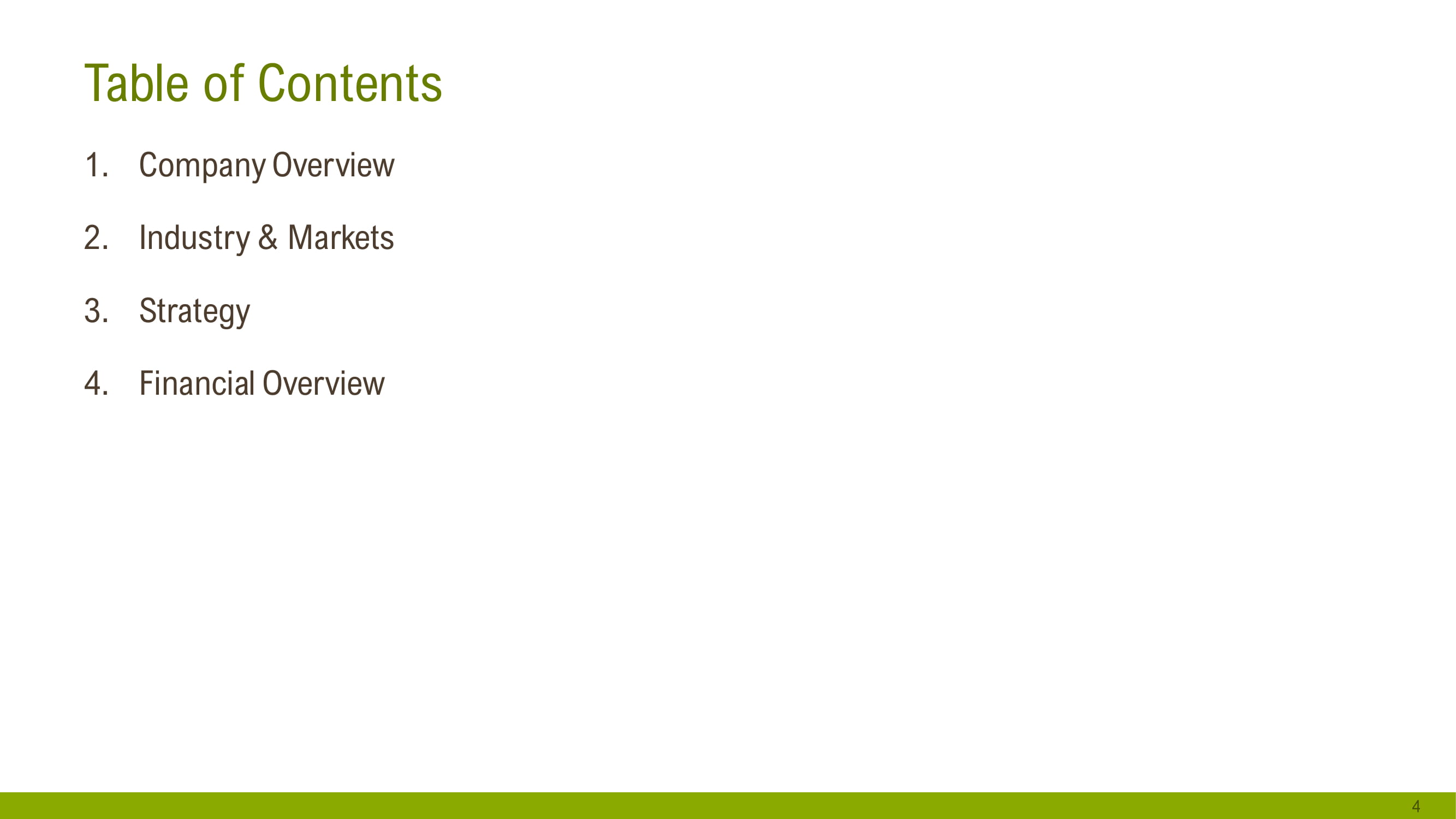 Table of Contents 1. Company Overview 2. Industry & Markets 3. Strategy 4. Financial Overview 4