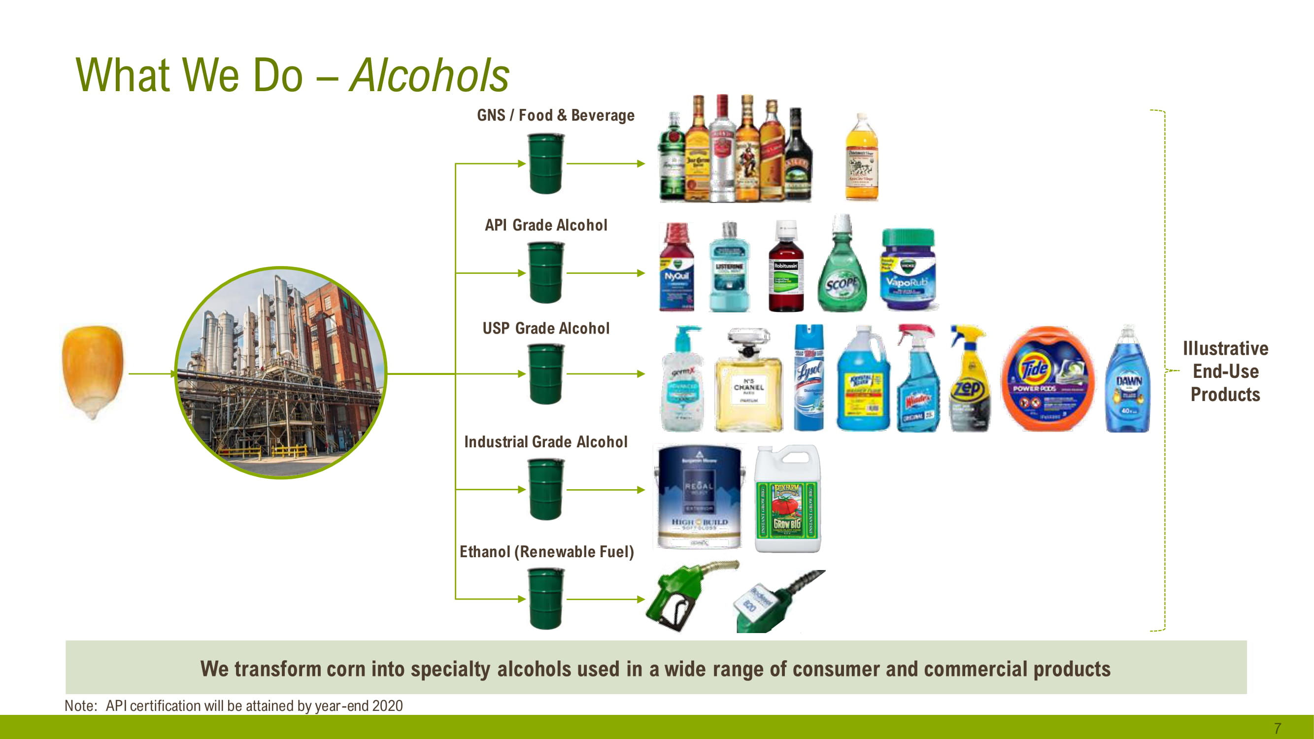 Who We Are • Major producer of specialty alcohols and essential ingredients • 180 Acre campus in Pekin, IL • 250 mmgy of alcohol production capacity • Focused on four key markets • Health, Home & Beauty • Food & Beverage • Essential Ingredients • Renewable Fuels • Unique capabilities to produce specialty alcohols – ~50% of production from GNS, USP, API and Industrial grades • Customers include major food & beverage and consumer products companies • Publicly traded with ~$690 million market capitalization (1) 6 (1) Based on $10.83 share price and 63.5mm shares outstanding as of October 19, 2020
