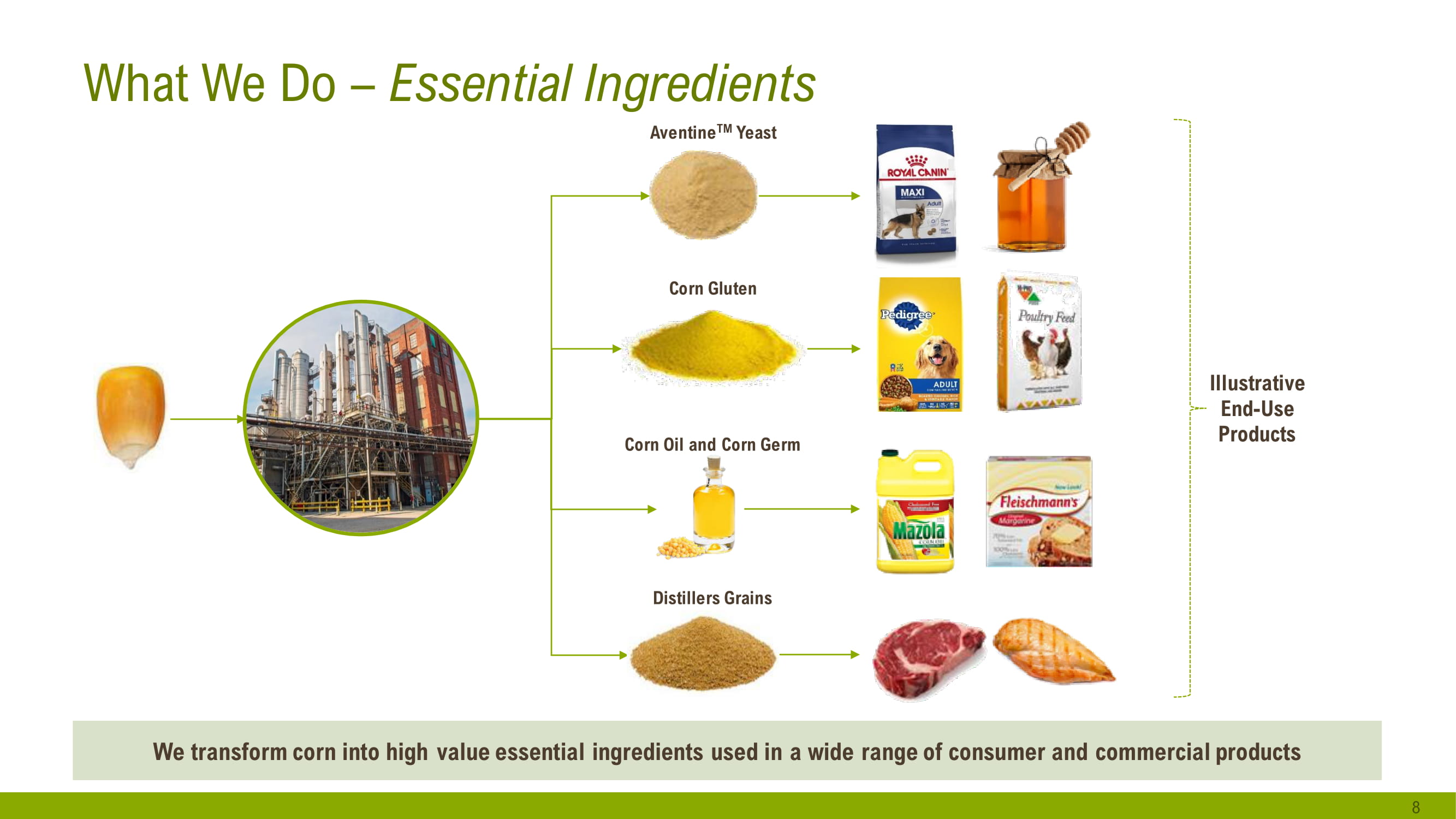 What We Do – Alcohols 7 GNS / Food & Beverage API Grade Alcohol Industrial Grade Alcohol USP Grade Alcohol Ethanol (Renewable Fuel) Note: API certification will be attained by year - end 2020 We transform corn into specialty alcohols used in a wide range of consumer and commercial products Illustrative End - Use Products