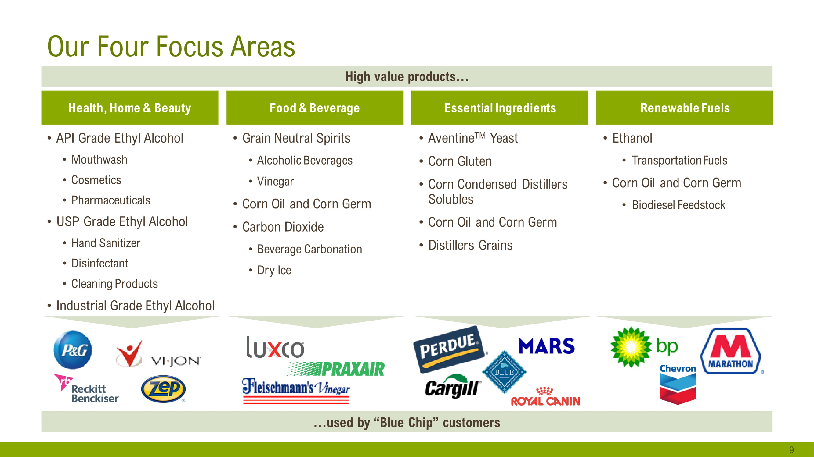 What We Do – Essential Ingredients 8 Aventine TM Yeast Corn Gluten We transform corn into high value essential ingredients used in a wide range of consumer and commercial products Distillers Grains Corn Oil and Corn Germ Illustrative End - Use Products