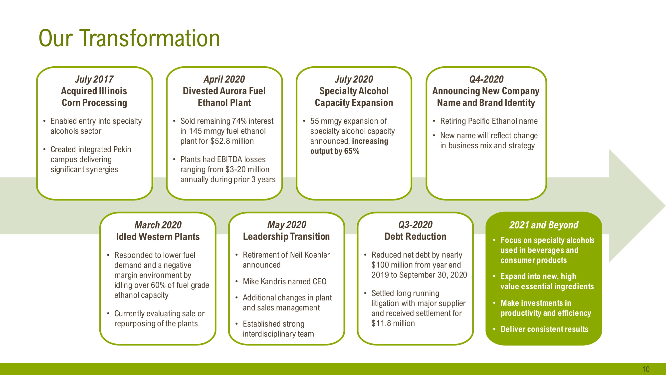 Our Four Focus Areas • API Grade Ethyl Alcohol • Mouthwash • Cosmetics • Pharmaceuticals • USP Grade Ethyl Alcohol • Hand Sanitizer • Disinfectant • Cleaning Products • Industrial Grade Ethyl Alcohol 9 Health, Home & Beauty Food & Beverage Essential Ingredients Renewable Fuels • Grain Neutral Spirits • Alcoholic Beverages • Vinegar • Corn Oil and Corn Germ • Carbon Dioxide • Beverage Carbonation • Dry Ice • Aventine TM Yeast • Corn Gluten • Corn Condensed Distillers Solubles • Corn Oil and Corn Germ • Distillers Grains • Ethanol • Transportation Fuels • Corn Oil and Corn Germ • Biodiesel Feedstock High value products… …used by “Blue Chip” customers
