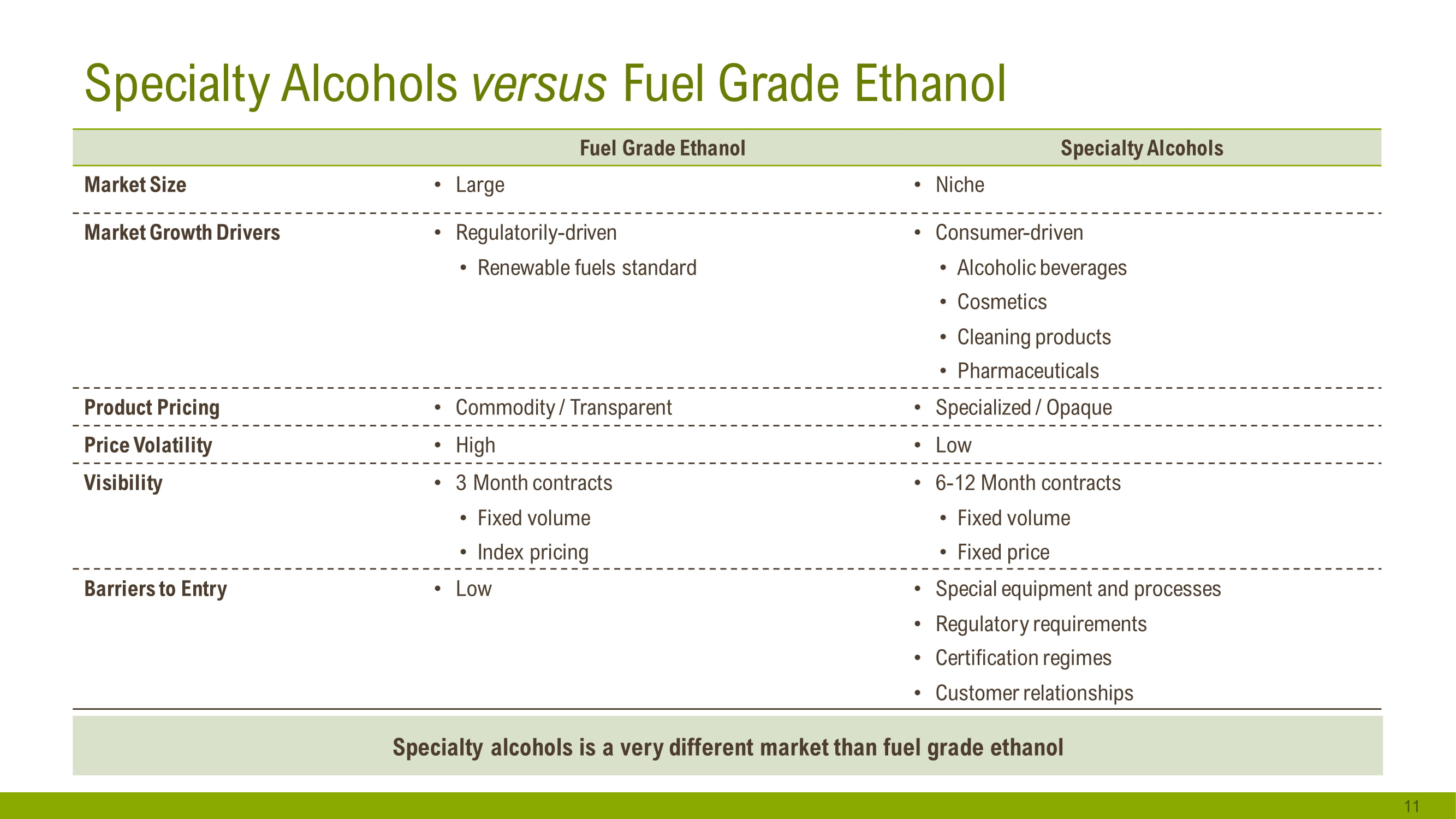 Our Transformation 10 July 2017 Acquired Illinois Corn Processing • Enabled entry into specialty alcohols sector • Created integrated Pekin campus delivering significant synergies April 2020 Divested Aurora Fuel Ethanol Plant • Sold remaining 74% interest in 145 mmgy fuel ethanol plant for $52.8 million • Plants had EBITDA losses ranging from $3 - 20 million annually during prior 3 years July 2020 Specialty Alcohol Capacity Expansion • 55 mmgy expansion of specialty alcohol capacity announced, increasing output by 65% Q4 - 2020 Announcing New Company Name and Brand Identity • Retiring Pacific Ethanol name • New name will reflect change in business mix and strategy Q3 - 2020 Debt Reduction • Reduced net debt by nearly $100 million from year end 2019 to September 30, 2020 • Settled long running litigation with major supplier and received settlement for $11.8 million May 2020 Leadership Transition • Retirement of Neil Koehler announced • Mike Kandris named CEO • Additional changes in plant and sales management • Established strong interdisciplinary team March 2020 Idled Western Plants • Responded to lower fuel demand and a negative margin environment by idling over 60% of fuel grade ethanol capacity • Currently evaluating sale or repurposing of the plants 2021 and Beyond • Focus on specialty alcohols used in beverages and consumer products • Expand into new, high value essential ingredients • Make investments in productivity and efficiency • Deliver consistent results