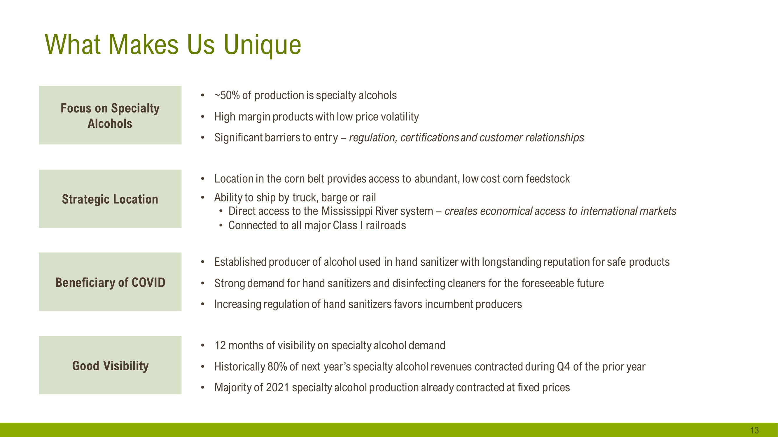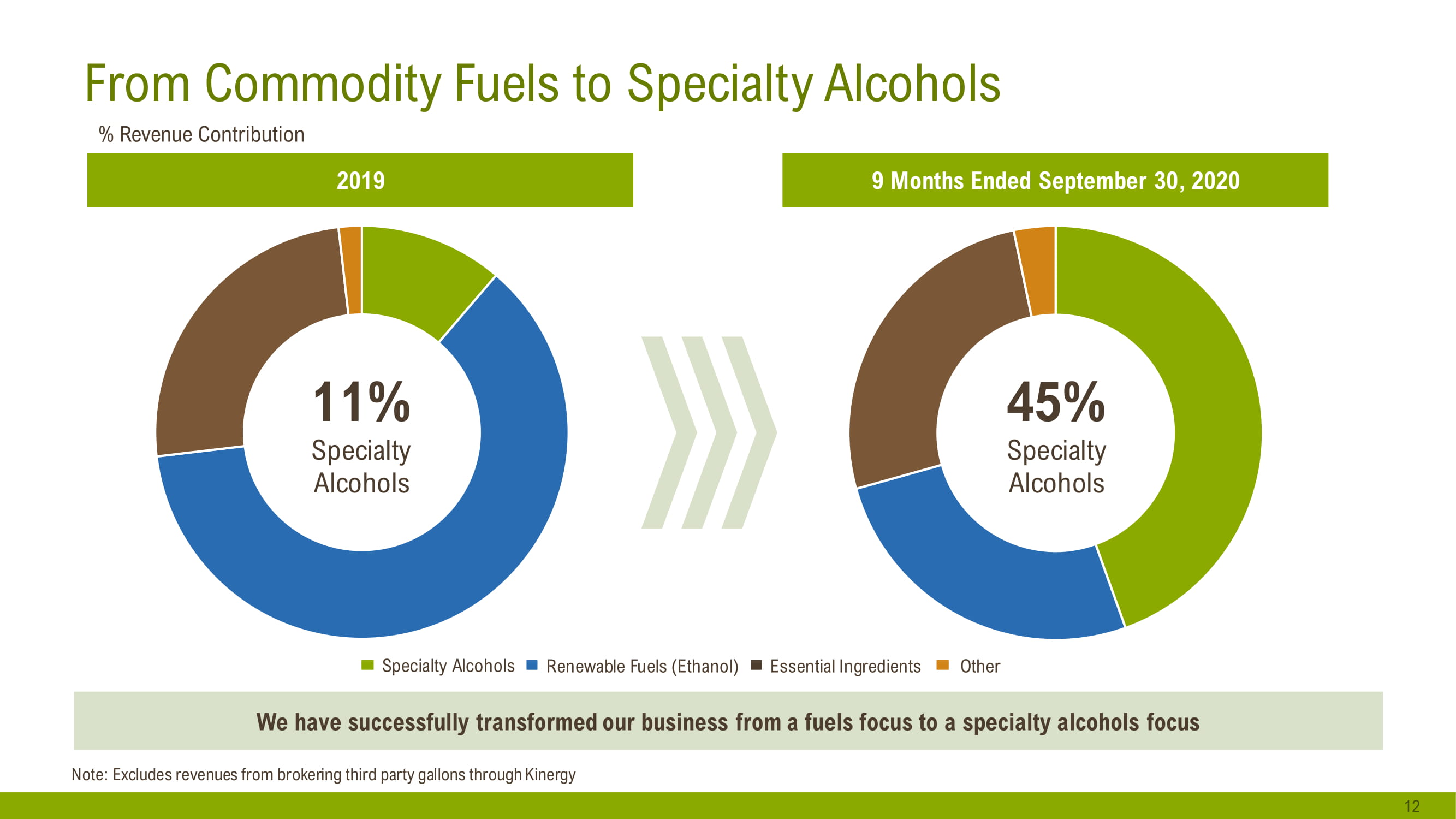 From Commodity Fuels to Specialty Alcohols 12 2019 9 Months Ended September 30, 2020 We have successfully transformed our business from a fuels focus to a specialty alcohols focus % Revenue Contribution Note: Excludes revenues from brokering third party gallons through Kinergy 11% Specialty Alcohols 45% Specialty Alcohols Specialty Alcohols Renewable Fuels (Ethanol) Essential Ingredients Other