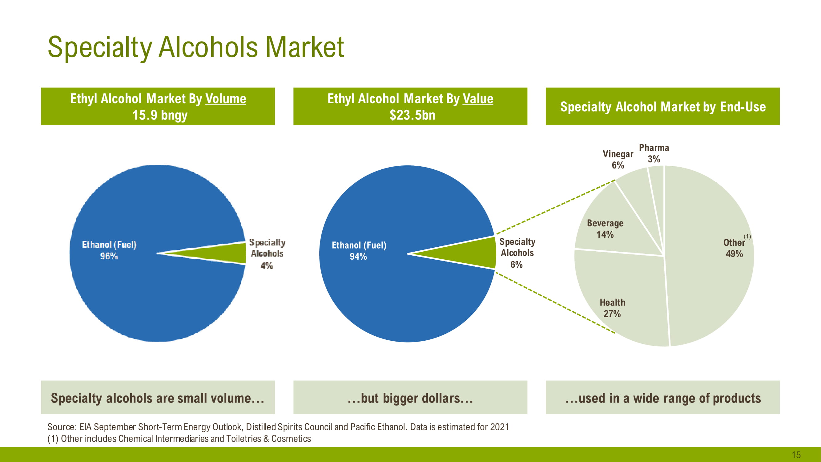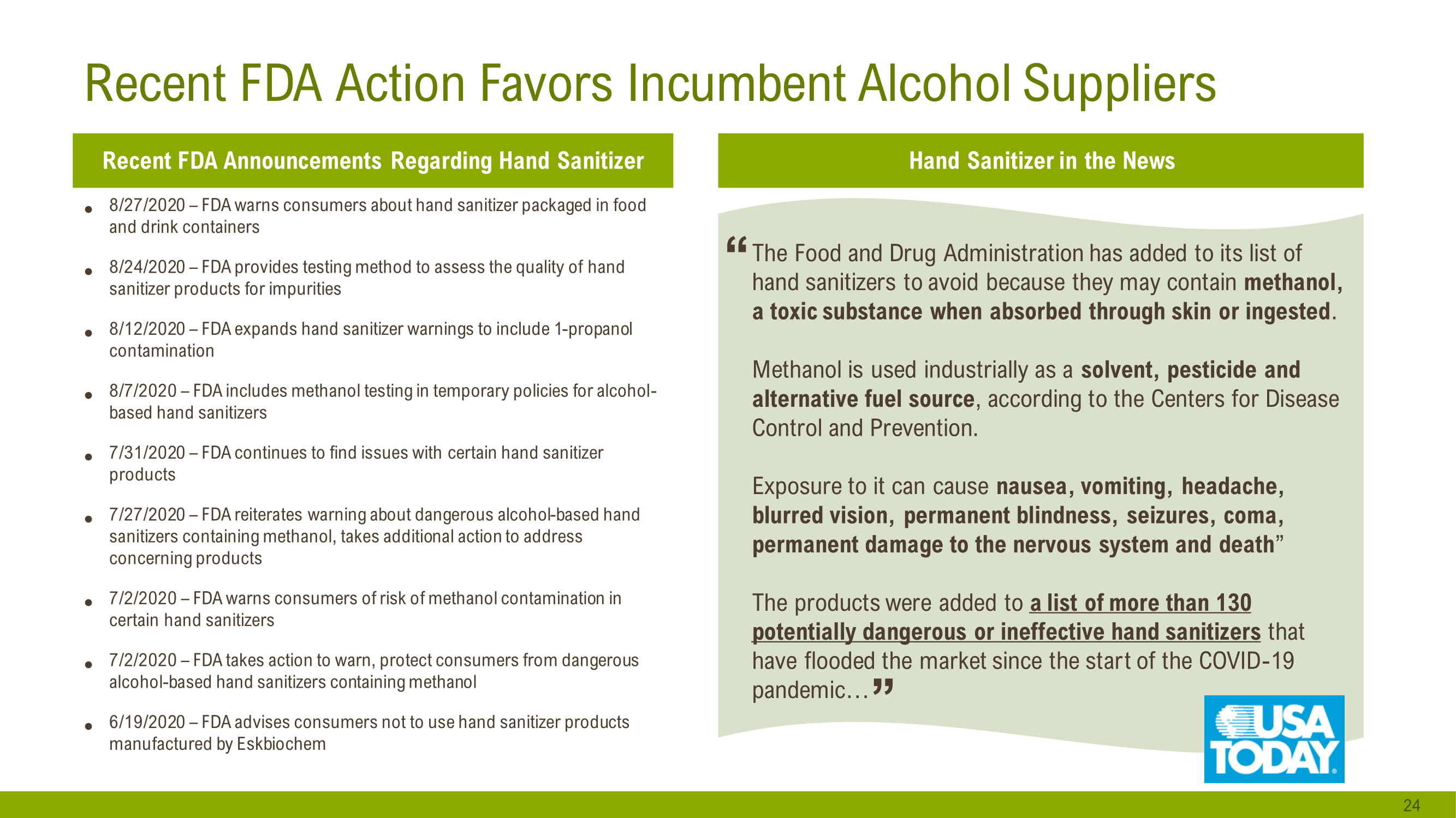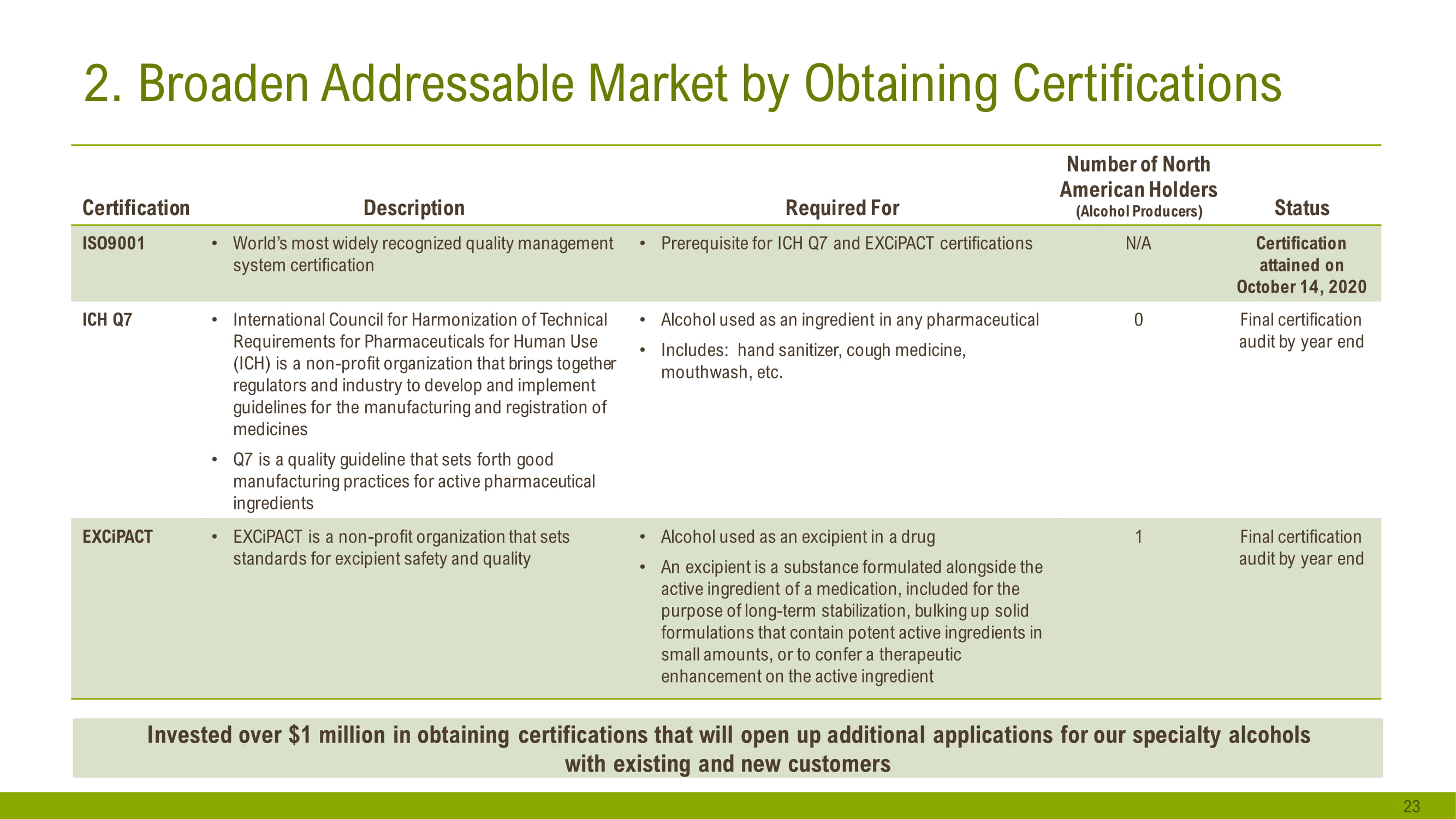2. Broaden Addressable Market by Obtaining Certifications Certification Description Required For Number of North American Holders (Alcohol Producers) Status ISO9001 • World’s most widely recognized quality management system certification • Prerequisite for ICH Q7 and EXCiPACT certifications N/A Certification attained on October 14, 2020 ICH Q7 • International Council for Harmonization of Technical Requirements for Pharmaceuticals for Human Use (ICH) is a non - profit organization that brings together regulators and industry to develop and implement guidelines for the manufacturing and registration of medicines • Q7 is a quality guideline that sets forth good manufacturing practices for active pharmaceutical ingredients • Alcohol used as an ingredient in any pharmaceutical • Includes: hand sanitizer, cough medicine, mouthwash, etc. 0 Final certification audit by year end EXCiPACT • EXCiPACT is a non - profit organization that sets standards for excipient safety and quality • Alcohol used as an excipient in a drug • An excipient is a substance formulated alongside the active ingredient of a medication, included for the purpose of long - term stabilization, bulking up solid formulations that contain potent active ingredients in small amounts, or to confer a therapeutic enhancement on the active ingredient 1 Final certification audit by year end 23 Invested over $1 million in obtaining certifications that will open up additional applications for our specialty alcohols with existing and new customers