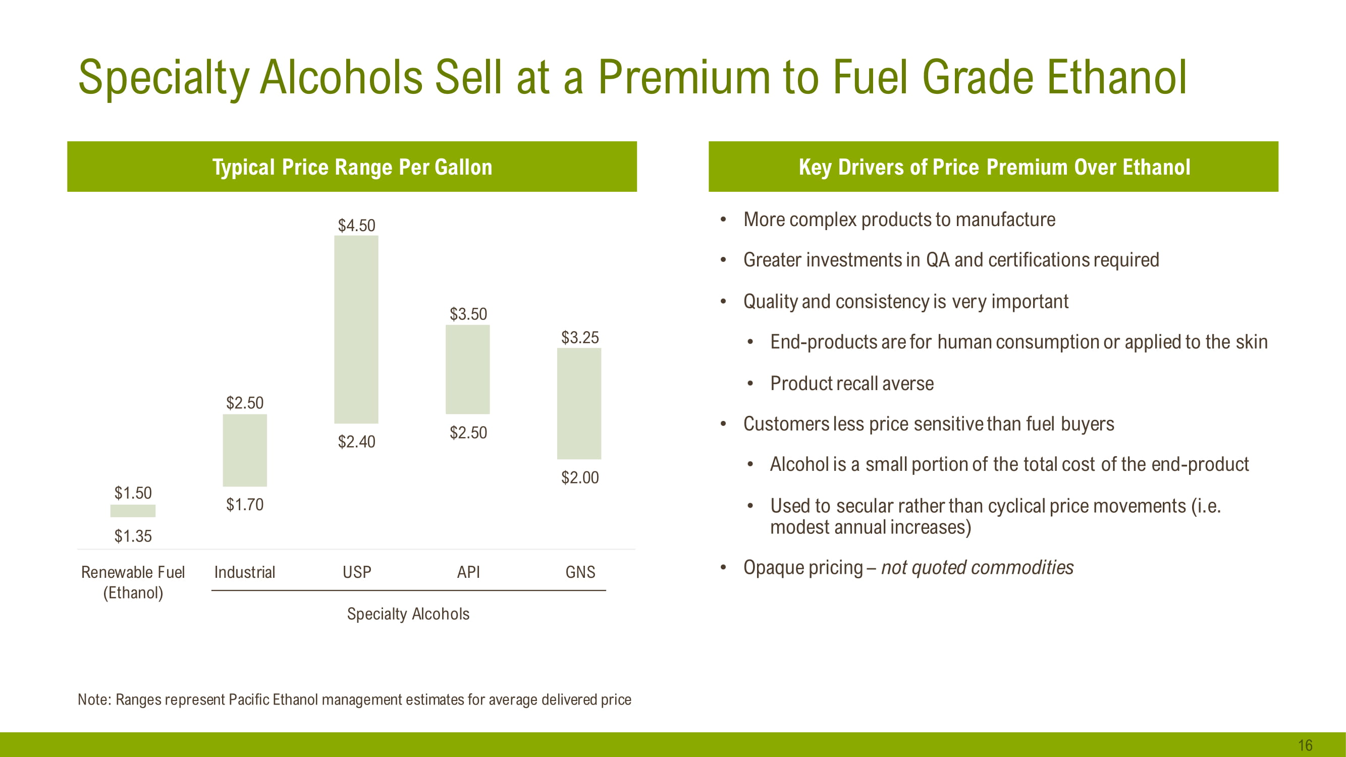 Other 49% Health 27% Beverage 14% Vinegar 6% Pharma 3% Ethanol (Fuel) 94% Specialty Alcohols 6% Specialty Alcohols Market 15 Ethyl Alcohol Market By Volume 15.9 bngy Ethyl Alcohol Market By Value $23.5bn Specialty alcohols are small volume… Source: EIA September Short - Term Energy Outlook, Distilled Spirits Council and Pacific Ethanol. Data is estimated for 2021 (1) Other includes Chemical Intermediaries and Toiletries & Cosmetics Specialty Alcohol Market by End - Use …but bigger dollars… …used in a wide range of products (1)