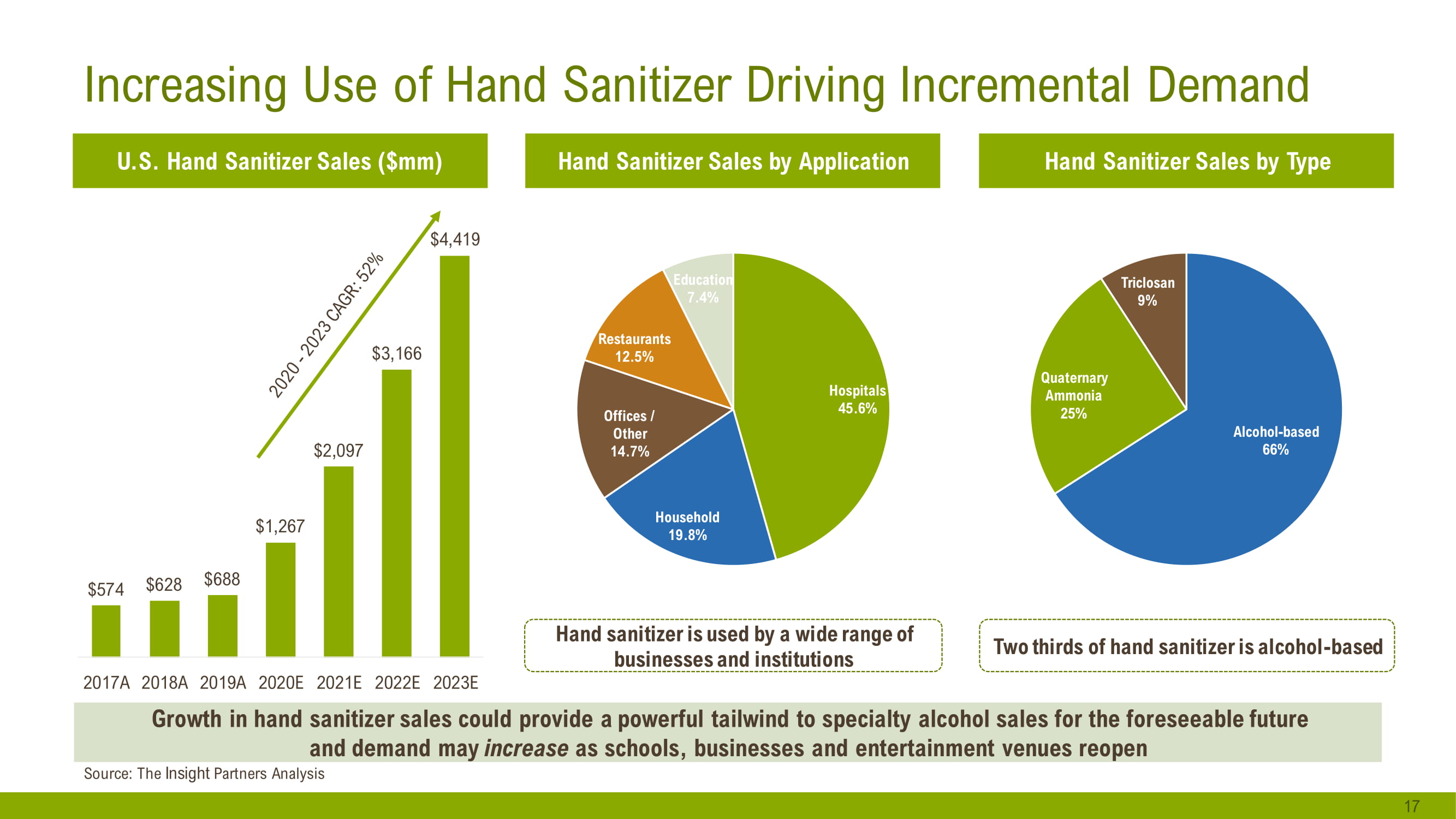 $574 $628 $688 $1,267 $2,097 $3,166 $4,419 2017A 2018A 2019A 2020E 2021E 2022E 2023E U.S. Hand Sanitizer Sales ($mm) Increasing Use of Hand Sanitizer Driving Incremental Demand 17 Source: The Insight Partners Analysis Hand Sanitizer Sales by Type Growth in hand sanitizer sales could provide a powerful tailwind to specialty alcohol sales for the foreseeable future and demand may increase as schools, businesses and entertainment venues reopen Two thirds of hand sanitizer is alcohol - based Hand Sanitizer Sales by Application Hospitals 45.6% Household 19.8% Offices / Other 14.7% Restaurants 12.5% Education 7.4% Hand sanitizer is used by a wide range of businesses and institutions