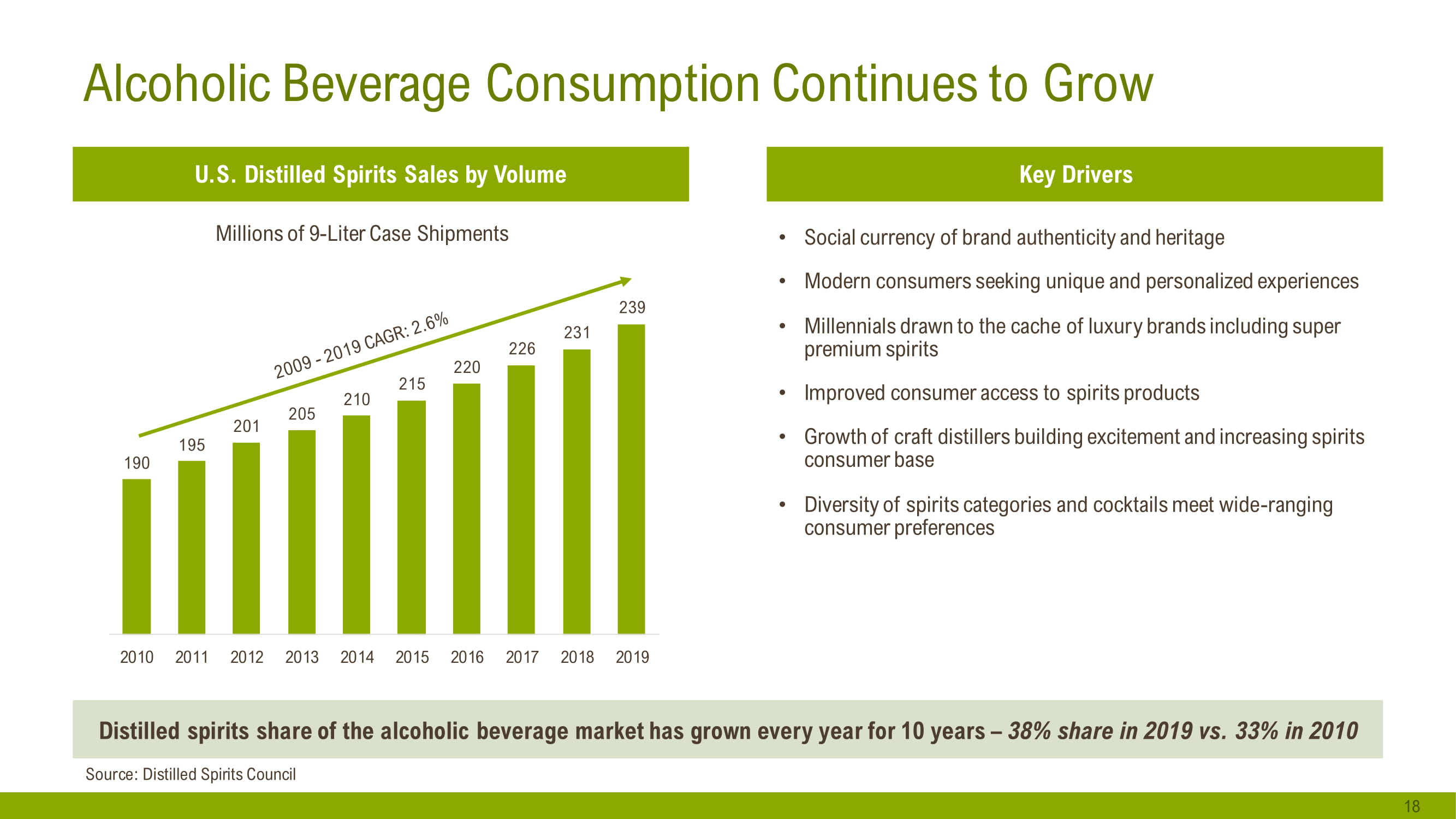 190 195 201 205 210 215 220 226 231 239 2010 2011 2012 2013 2014 2015 2016 2017 2018 2019 Alcoholic Beverage Consumption Continues to Grow 18 U.S. Distilled Spirits Sales by Volume Key Drivers • Social currency of brand authenticity and heritage • Modern consumers seeking unique and personalized experiences • Millennials drawn to the cache of luxury brands including super premium spirits • Improved consumer access to spirits products • Growth of craft distillers building excitement and increasing spirits consumer base • Diversity of spirits categories and cocktails meet wide - ranging consumer preferences Distilled spirits share of the alcoholic beverage market has grown every year for 10 years – 38% share in 2019 vs. 33% in 2010 Source: Distilled Spirits Council Millions of 9 - Liter Case Shipments