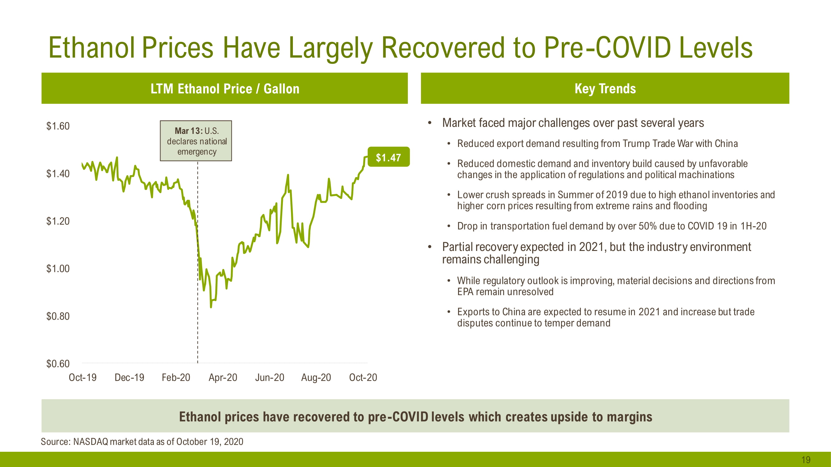 $0.60 $0.80 $1.00 $1.20 $1.40 $1.60 Oct-19 Dec-19 Feb-20 Apr-20 Jun-20 Aug-20 Oct-20 Ethanol Prices Have Largely Recovered to Pre - COVID Levels 19 Source: NASDAQ market data as of October 19, 2020 Ethanol prices have recovered to pre - COVID levels which creates upside to margins LTM Ethanol Price / Gallon Key Trends • Market faced major challenges over past several years • Reduced export demand resulting from Trump Trade War with China • Reduced domestic demand and inventory build caused by unfavorable changes in the application of regulations and political machinations • Lower crush spreads in Summer of 2019 due to high ethanol inventories and higher corn prices resulting from extreme rains and flooding • Drop in transportation fuel demand by over 50% due to COVID 19 in 1H - 20 • Partial recovery expected in 2021, but the industry environment remains challenging • While regulatory outlook is improving, material decisions and directions from EPA remain unresolved • Exports to China are expected to resume in 2021 and increase but trade disputes continue to temper demand $1.47 Mar 13: U.S. declares national emergency