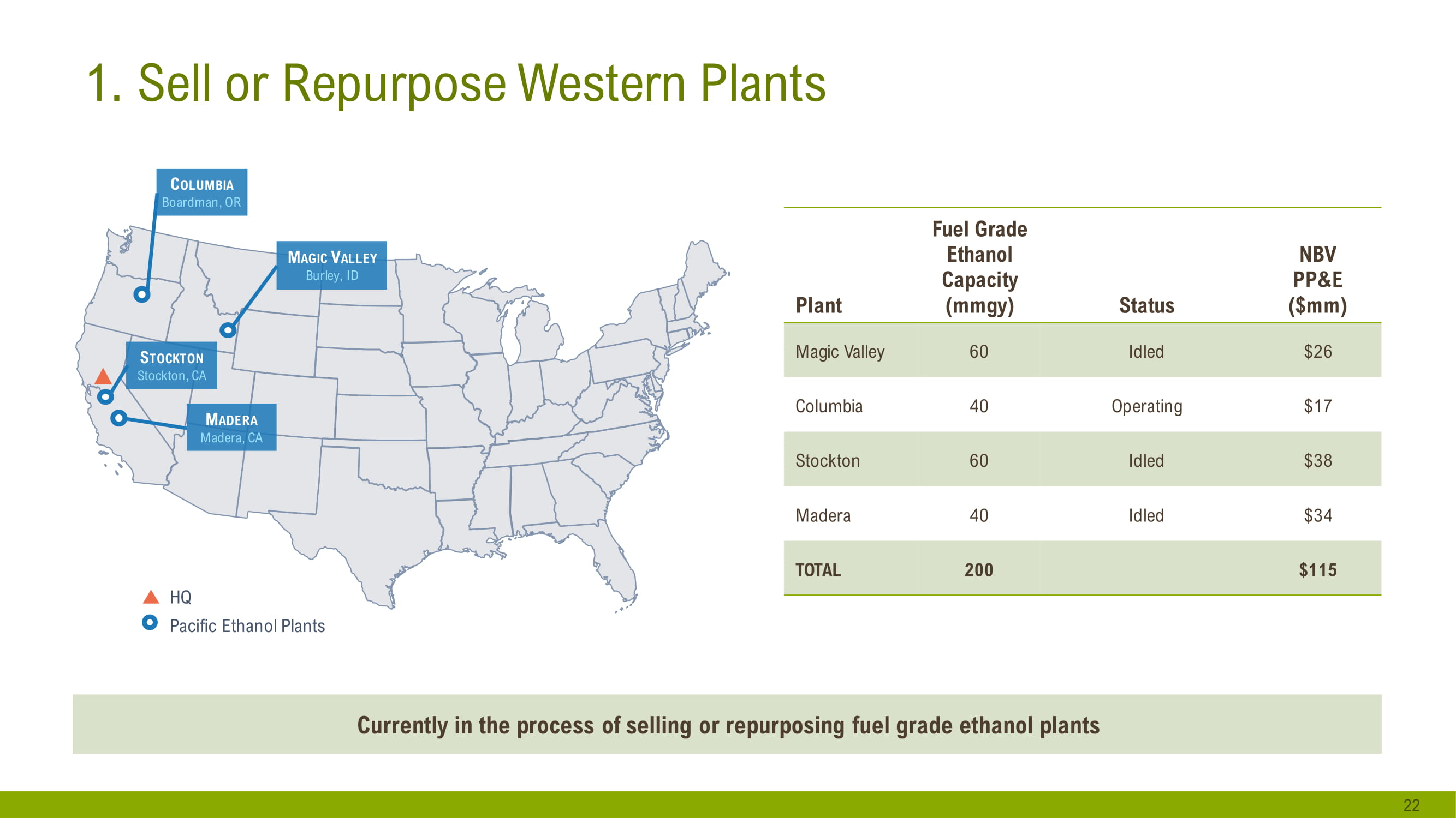 1. Sell or Repurpose Western Plants 22 Plant Fuel Grade Ethanol Capacity (mmgy) Status NBV PP&E ($mm) Magic Valley 60 Idled $26 Columbia 40 Operating $17 Stockton 60 Idled $38 Madera 40 Idled $34 TOTAL 200 $115 C OLUMBIA Boardman, OR S TOCKTON Stockton, CA M ADERA Madera, CA M AGIC V ALLEY Burley, ID HQ Pacific Ethanol Plants Currently in the process of selling or repurposing fuel grade ethanol plants