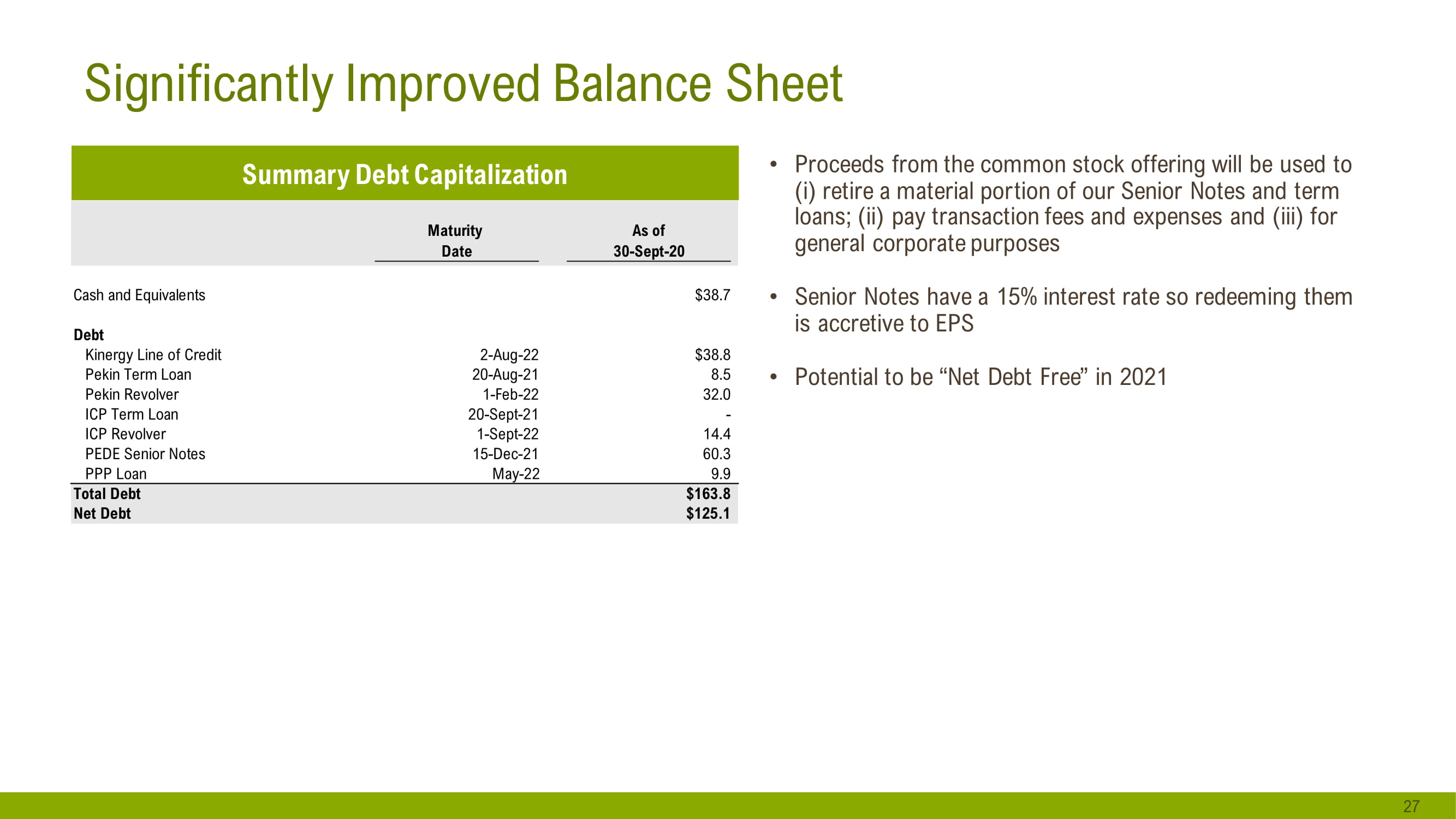 Significantly Improved Balance Sheet 27 Summary Debt Capitalization • Proceeds from the common stock offering will be used to (i) retire a material portion of our Senior Notes and term loans; (ii) pay transaction fees and expenses and (iii) for general corporate purposes • Senior Notes have a 15% interest rate so redeeming them is accretive to EPS • Potential to be “Net Debt Free” in 2021 Maturity As of Date 30-Sept-20 Cash and Equivalents $38.7 Debt Kinergy Line of Credit 2-Aug-22 $38.8 Pekin Term Loan 20-Aug-21 8.5 Pekin Revolver 1-Feb-22 32.0 ICP Term Loan 20-Sept-21 - ICP Revolver 1-Sept-22 14.4 PEDE Senior Notes 15-Dec-21 60.3 PPP Loan May-22 9.9 Total Debt $163.8 Net Debt $125.1 Shareholders' Equity 245.2 Total Shareholders' Equity $245.2 Total Debt & Shareholders' Equity $409.0