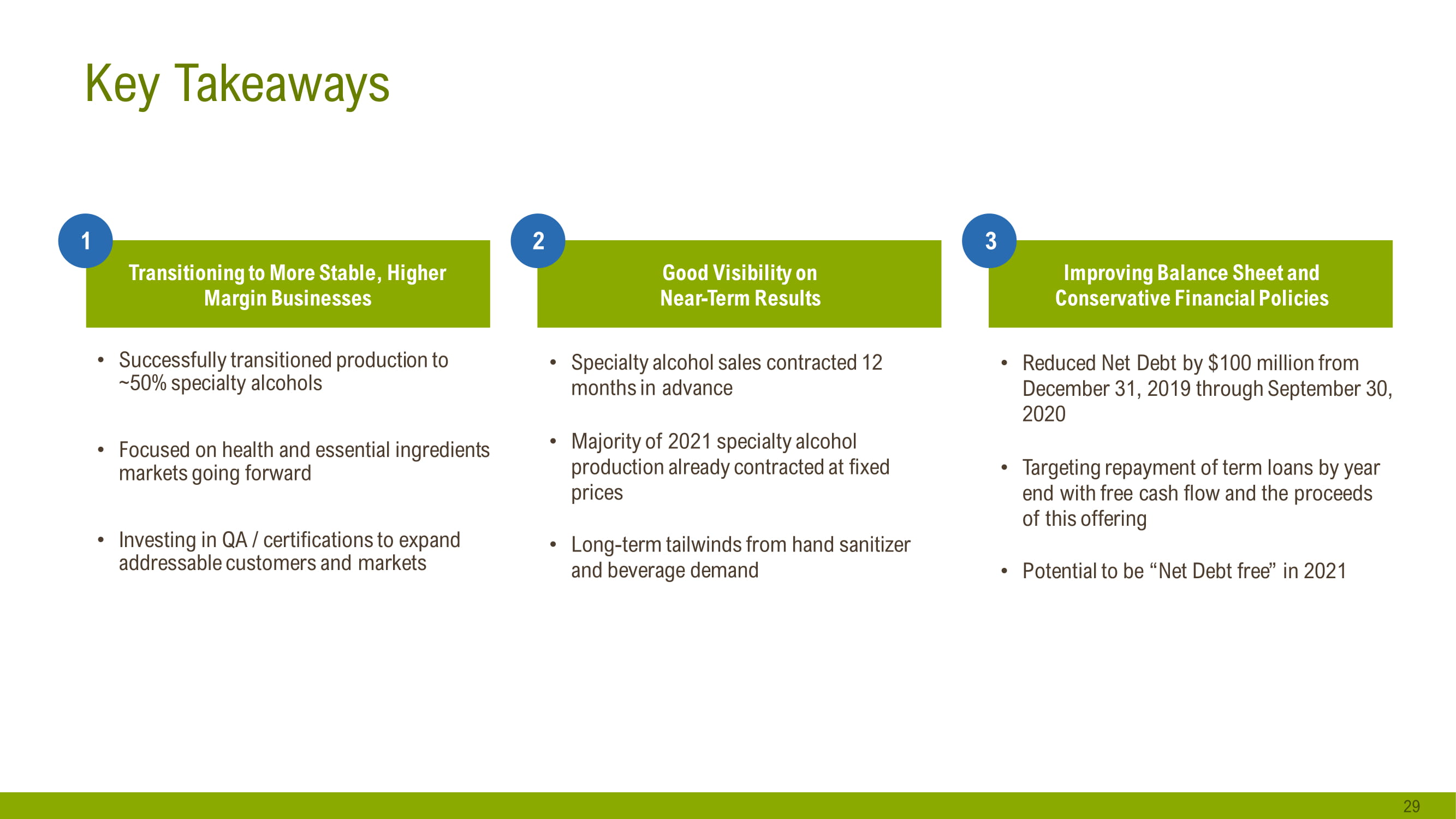 Key Takeaways • Successfully transitioned production to ~50% specialty alcohols • Focused on health and essential ingredients markets going forward • Investing in QA / certifications to expand addressable customers and markets 29 Transitioning to More Stable, Higher Margin Businesses 1 Good Visibility on Near - Term Results 2 Improving Balance Sheet and Conservative Financial Policies 3 • Specialty alcohol sales contracted 12 months in advance • Majority of 2021 specialty alcohol production already contracted at fixed prices • Long - term tailwinds from hand sanitizer and beverage demand • Reduced Net Debt by $100 million from December 31, 2019 through September 30, 2020 • Targeting repayment of term loans by year end with free cash flow and the proceeds of this offering • Potential to be “Net Debt free” in 2021