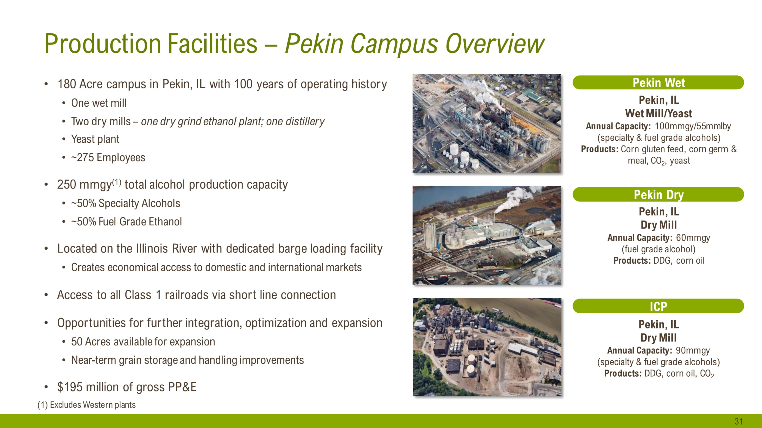 Production Facilities – Pekin Campus Overview 31 • 180 Acre campus in Pekin, IL with 100 years of operating history • One wet mill • Two dry mills – one dry grind ethanol plant; one distillery • Yeast plant • ~275 Employees • 250 mmgy (1) total alcohol production capacity • ~50% Specialty Alcohols • ~50% Fuel Grade Ethanol • Located on the Illinois River with dedicated barge loading facility • Creates economical access to domestic and international markets • Access to all Class 1 railroads via short line connection • Opportunities for further integration, optimization and expansion • 50 Acres available for expansion • Near - term grain storage and handling improvements • $195 million of gross PP&E ICP Pekin, IL Dry Mill Annual Capacity: 90mmgy (specialty & fuel grade alcohols) Products: DDG, corn oil, CO 2 Pekin Wet Pekin, IL Wet Mill/Yeast Annual Capacity: 100mmgy/55mmlby (specialty & fuel grade alcohols) Products: Corn gluten feed, corn germ & meal, CO 2 , yeast Pekin Dry Pekin, IL Dry Mill Annual Capacity: 60mmgy (fuel grade alcohol) Products: DDG, corn oil (1) Excludes Western plants