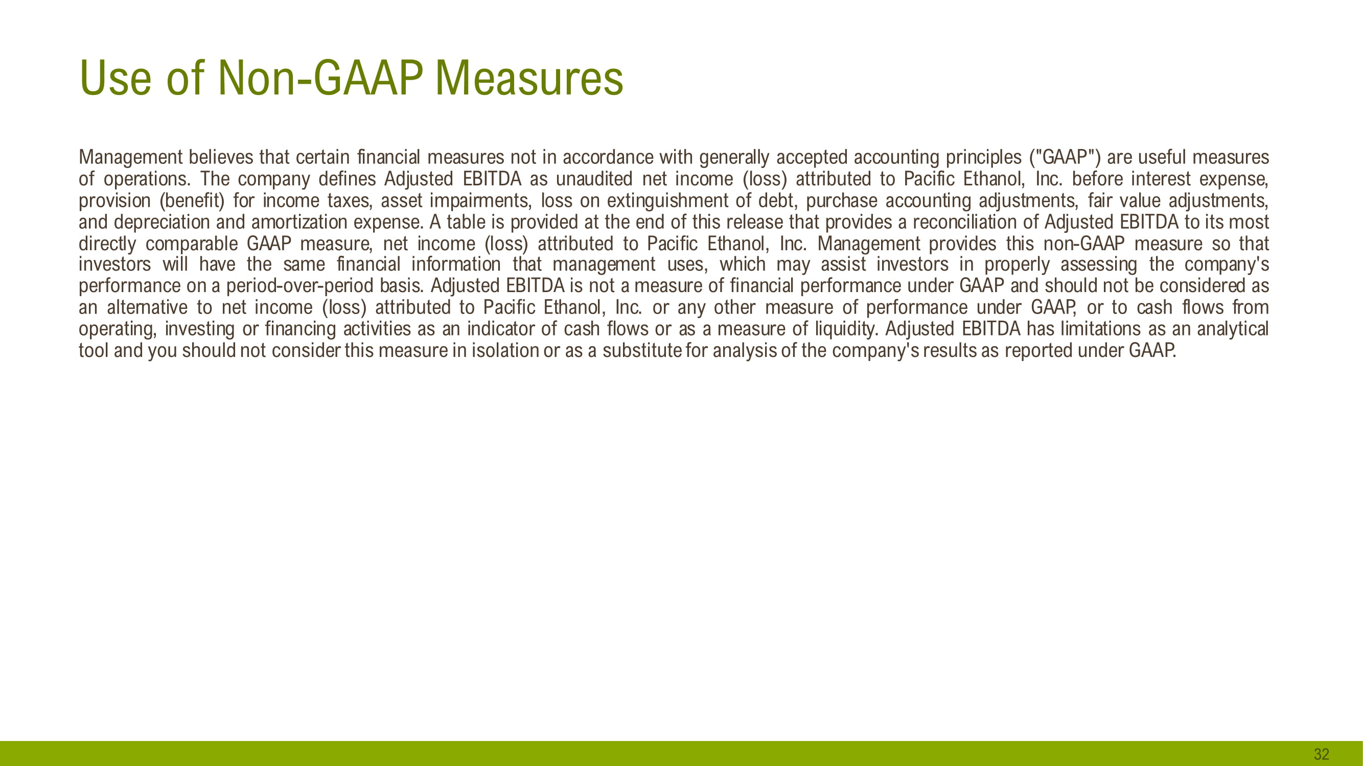 Use of Non - GAAP Measures 32 Management believes that certain financial measures not in accordance with generally accepted accounting principles ("GAAP") are useful measures of operations . The company defines Adjusted EBITDA as unaudited net income (loss) attributed to Pacific Ethanol, Inc . before interest expense, provision (benefit) for income taxes, asset impairments, loss on extinguishment of debt, purchase accounting adjustments, fair value adjustments, and depreciation and amortization expense . A table is provided at the end of this release that provides a reconciliation of Adjusted EBITDA to its most directly comparable GAAP measure, net income (loss) attributed to Pacific Ethanol, Inc . Management provides this non - GAAP measure so that investors will have the same financial information that management uses, which may assist investors in properly assessing the company's performance on a period - over - period basis . Adjusted EBITDA is not a measure of financial performance under GAAP and should not be considered as an alternative to net income (loss) attributed to Pacific Ethanol, Inc . or any other measure of performance under GAAP, or to cash flows from operating, investing or financing activities as an indicator of cash flows or as a measure of liquidity . Adjusted EBITDA has limitations as an analytical tool and you should not consider this measure in isolation or as a substitute for analysis of the company's results as reported under GAAP .