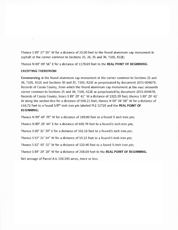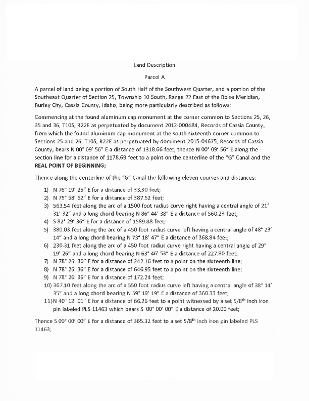 (a) That certain real property located in Cassia County, Idaho as more particularly described in Exhibit A attached hereto and incorporated herein (the “Land”). The Land is depicted as “Parcel A” in that certain record of survey attached hereto and incorporated herein as Exhibit B;