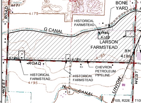 In 2006, Parcels A and B together were known as the Glen Larsen Farm, which was used primarily as an irrigated agricultural and pasture land that included one farmstead on the east boundary of Parcel B. The Glen Larsen Farm was inspected for conditions such as stained ground and pavement, stressed vegetation, unauthorized dumping, and evidence of the use, storage, or release of hazardous materials. If any petroleum products, chemicals, or other potentially hazardous or regulated materials were found on the premises, they were noted. Reasonably ascertainable information was also gathered regarding underground and aboveground storage tanks, surficial and subsurface soil and ground water conditions, and land use on and around the subject property.