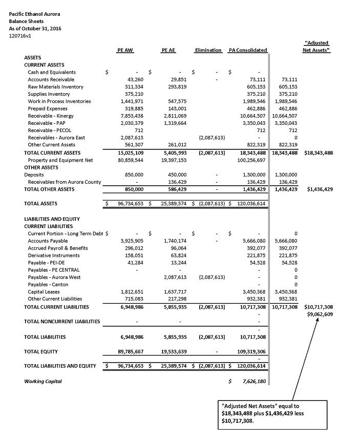 “Adjusted Net Assets” means the value, as of the Closing Date, of (i) the sum of cash and cash equivalents, accounts receivable, inventory (including raw materials, supplies and work in process), prepaid expenses, intercompany/related party receivables (to the extent not eliminated in consolidation of AW and AE), derivatives (to the extent an asset), deposits (including bonds) and any other assets agreed to by PEC and ACEC, in each case owned by the Plant Owners as of the Closing Date, minus (ii) the sum of accounts payable, accrued payroll and benefits, derivatives (to the extent a liability), intercompany/related party payables (to the extent not eliminated in consolidation of AW and AE), outstanding capital leases, accrued taxes, and any other liabilities agreed to by PEC and ACEC, in each case owed by the Plant Owners as of the Closing Date, with all of the foregoing as calculated in accordance with GAAP and the example set forth in Exhibit A hereto, it being acknowledged and agreed by the parties that Exhibit A hereto represents an example only and is not a prediction of the Adjusted Net Assets as of the Closing.